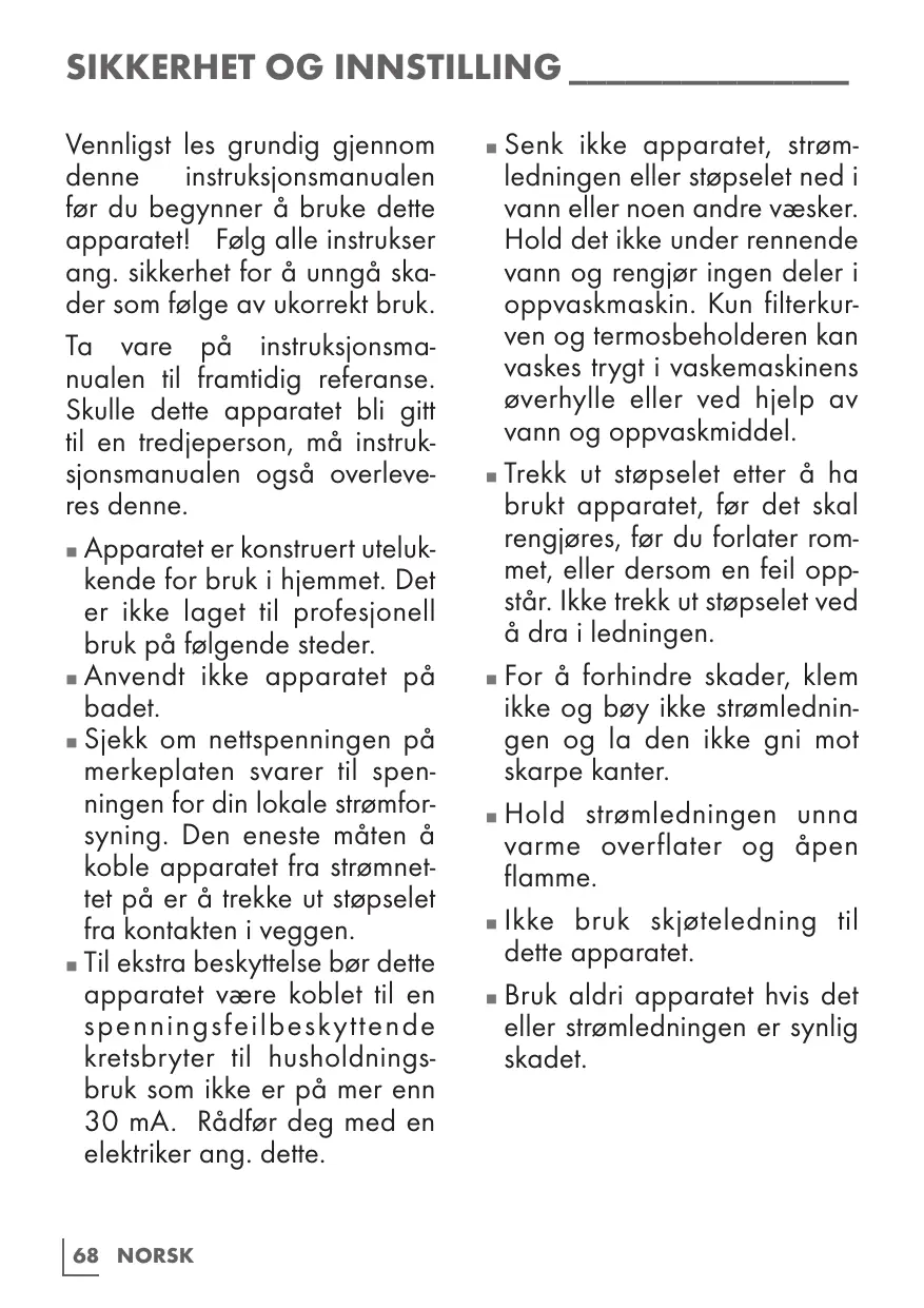 SIKKERHET OG INNSTILLING________________ Vennligst les grundig gjennom denne instruksjonsmanualen før du begynner å bruke dette apparatet! Følg alle instrukser ang. sikkerhet for å unngå skader som følge av ukorrekt bruk. Ta vare på instruksjonsmanualen til framtidig referanse. Skulle dette apparatet bli gitt til en tredjeperson, må instruksjonsmanualen også overleveres denne. Apparatet er konstruert utelukkende for bruk i hjemmet. Det er ikke laget til profesjonell bruk på følgende steder. Anvendt ikke apparatet på badet. Sjekk om nettspenningen på merkeplaten svarer til spenningen for din lokale strømforsyning. Den eneste måten å koble apparatet fra strømnettet på er å trekke ut støpselet fra kontakten i veggen. Til ekstra beskyttelse bør dette apparatet være koblet til en spenningsfeilbeskyttende kretsbryter til husholdningsbruk som ikke er på mer enn 30 mA. Rådfør deg med en elektriker ang. dette.