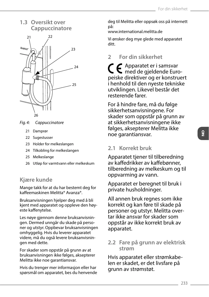 L'appareil respecte les directives européennes en vigueur et a été construit selon le niveau technologique le plus actuel. Il existe cependant des risques résiduels. Respecter les consignes de sécurité pour éviter tout danger. Melitta n'est pas responsable en cas de non-respect du mode d'emploi normal de l'appareil. 2.1 Utilisation réglementaire L'appareil sert à préparer des boissons à partir de grains de café, de la mousse de lait et à chauffer de l'eau. L'appareil est uniquement destiné à un usage domestique. Toute autre utilisation est considérée comme non réglementaire et peut provoquer des dommages corporels et matériels. Melitta ne répond pas de dommages consécutifs à une utilisation non réglementaire. 2.2 Danger dû au courant électrique Il y a danger de mort par choc électrique en cas d'endommage63