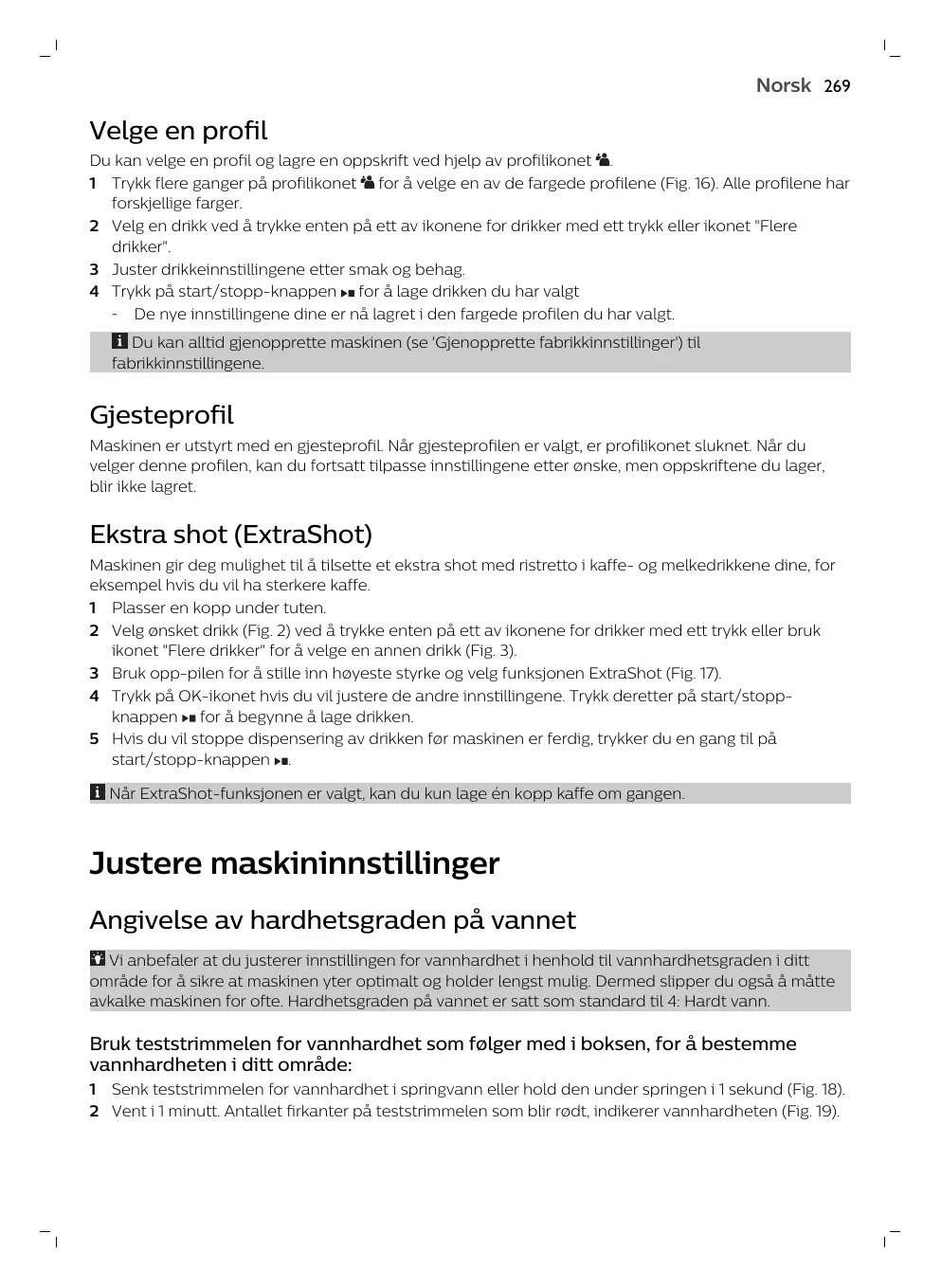 Ekstra shot (ExtraShot) Maskinen gir deg mulighet til å tilsette et ekstra shot med ristretto i kaffe- og melkedrikkene dine, for eksempel hvis du vil ha sterkere kaffe. 1 Plasser en kopp under tuten. 2 Velg ønsket drikk (Fig. 2) ved å trykke enten på ett av ikonene for drikker med ett trykk eller bruk ikonet "Flere drikker" for å velge en annen drikk (Fig. 3). 3 Bruk opp-pilen for å stille inn høyeste styrke og velg funksjonen ExtraShot (Fig. 17). 4 Trykk på OK-ikonet hvis du vil justere de andre innstillingene. Trykk deretter på start/stoppknappen for å begynne å lage drikken. 5 Hvis du vil stoppe dispensering av drikken før maskinen er ferdig, trykker du en gang til på start/stopp-knappen . Når ExtraShot-funksjonen er valgt, kan du kun lage én kopp kaffe om gangen.