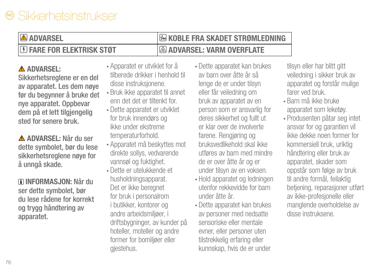 - • Dette er utelukkende et husholdningsapparat. Det er ikke beregnet for bruk i personalrom i butikker, kontorer og andre arbeidsmiljøer, i driftsbygninger, av kunder på hoteller, moteller og andre former for bomiljøer eller gjestehus.