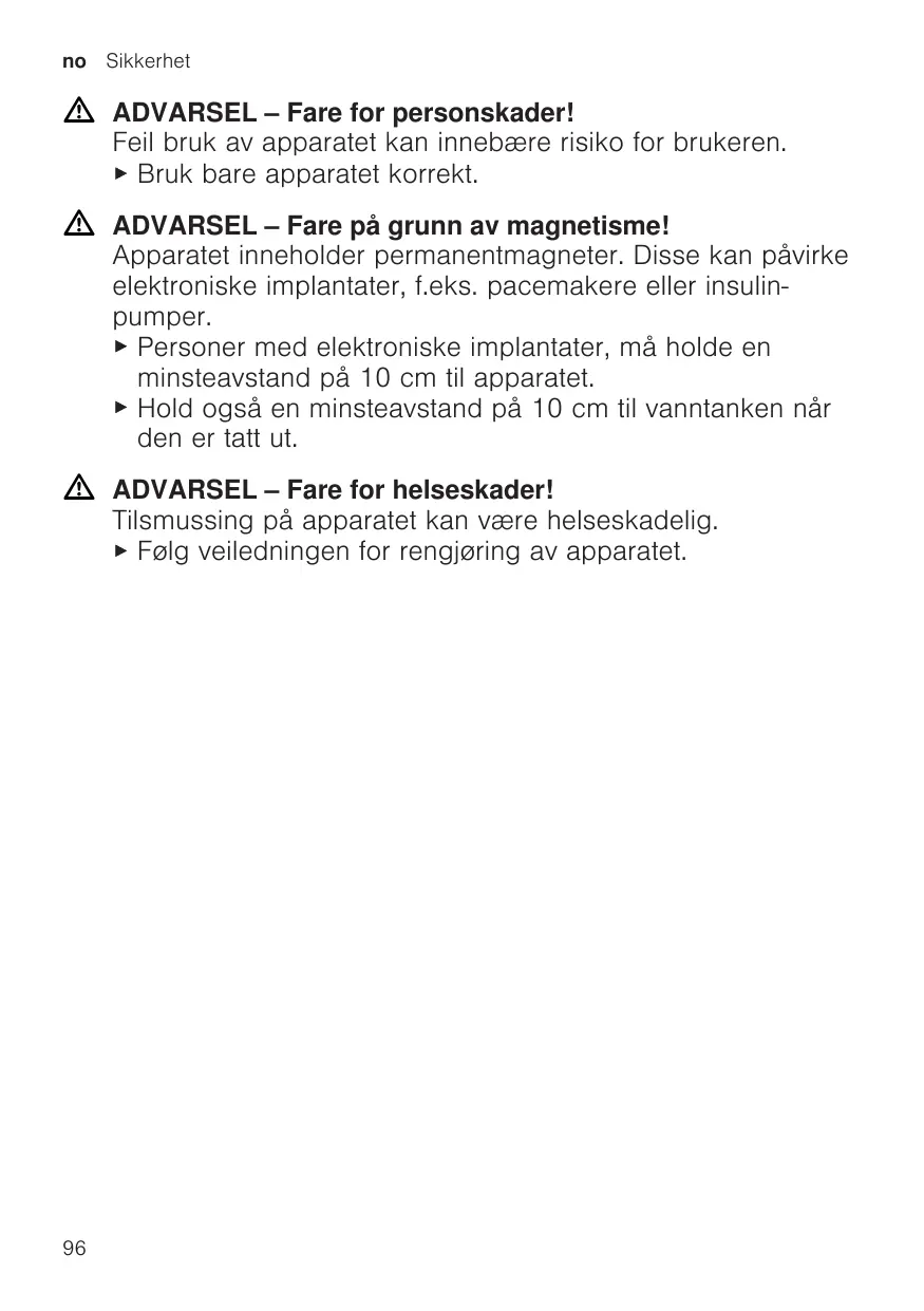 ADVARSEL ‒ Fare for personskader! Feil bruk av apparatet kan innebære risiko for brukeren. ▶ Bruk bare apparatet korrekt. ADVARSEL ‒ Fare på grunn av magnetisme! Apparatet inneholder permanentmagneter. Disse kan påvirke elektroniske implantater, f.eks. pacemakere eller insulinpumper. ▶ Personer med elektroniske implantater, må holde en minsteavstand på 10 cm til apparatet. ▶ Hold også en minsteavstand på 10 cm til vanntanken når den er tatt ut. ADVARSEL ‒ Fare for helseskader! Tilsmussing på apparatet kan være helseskadelig. ▶ Følg veiledningen for rengjøring av apparatet.