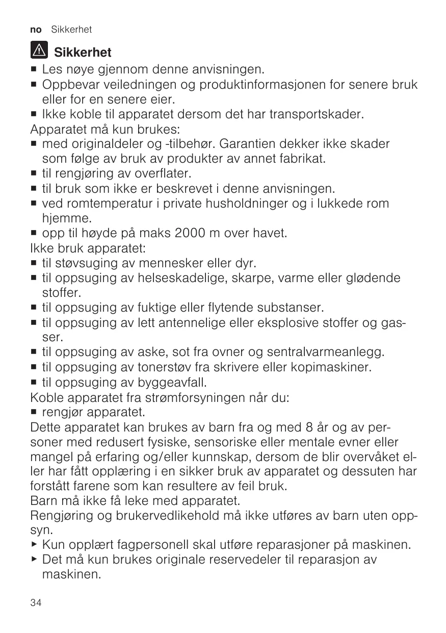 ¡ Read this instruction manual carefully. ¡ Keep the instruction manual and the product information safe for future reference or for the next owner. ¡ avec des pièces et accessoires d’origine. En cas de dommages dus à l’utilisation de produits tiers, le droit à la garantie expire. ¡ pour nettoyer les surfaces. ¡ pour les utilisations décrites dans cette notice. ¡ pour un usage domestique privé et dans les pièces fermées d’un domicile, à la température ambiante. ¡ jusqu'à une altitude maximale de 2000 m au-dessus du niveau de la mer. N’utilisez pas l’appareil : ¡ pour l’aspiration de personnes et d’animaux. ¡ pour l’aspiration de substances nocives pour la santé, aux arêtes vives, chaudes ou brûlantes. ¡ pour l’aspiration de substances humides ou liquides. ¡ pour l’aspiration de substances et gaz légèrement inflammables ou explosibles. ¡ pour l’aspiration de cendres, de la suie de four et d’installations de chauffage central. ¡ pour l’aspiration de poussières de toner des imprimantes et copieurs. ¡ pour l’aspiration de débris de construction. Débranchez l’appareil du secteur lorsque : ¡ vous nettoyez l’appareil. Les enfants de 8 ans et plus, les personnes souffrant d’un handicap physique, sensoriel ou mental ou ne détenant pas l’expérience et/ou les connaissances nécessaires pourront utiliser cet appareil à condition de le faire sous surveillance, ou que son utilisation sûre leur ait été enseignée et qu’ils aient compris les dangers qui en émanent. Les enfants ne sont pas autorisés à jouer avec l'appareil. 17