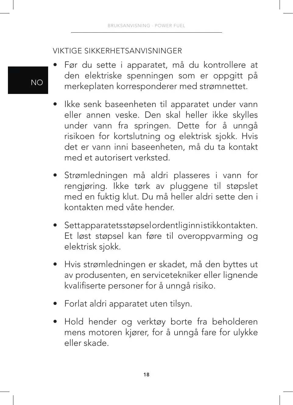 - Ikke senk baseenheten til apparatet under vann eller annen veske. Den skal heller ikke skylles under vann fra springen. Dette for å unngå risikoen for kortslutning og elektrisk sjokk. Hvis det er vann inni baseenheten, må du ta kontakt med et autorisert verksted.