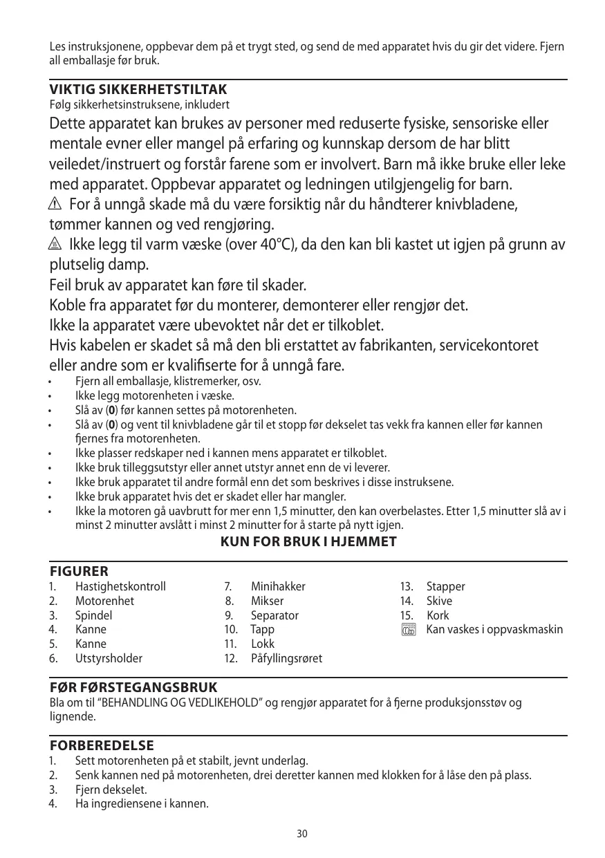 No ponga utensilios en la jarra cuando el aparato esté enchufado. No utilice ningún accesorio que no haya sido adquirido del fabricante. No use el aparato para ningún fin distinto a los descritos en estas instrucciones. No use el aparato si está dañado o si no funciona bien. No haga funcionar el motor constantemente por más de 1 minuto y medio, se puede sobrecalentar. Después de 1 minuto y medio, apáguelo durante al menos 2 minutos, para que se recupere.