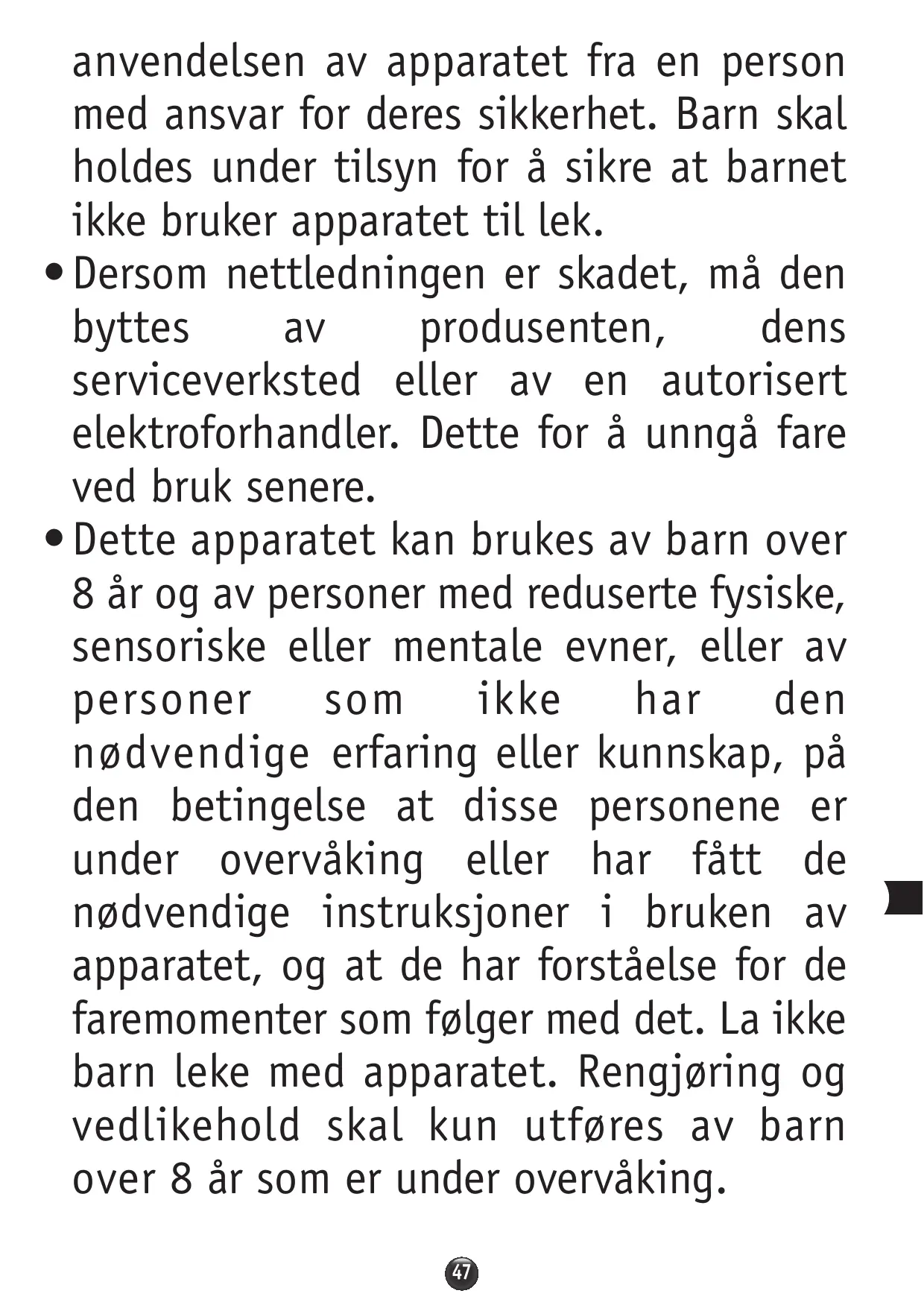 Il convient de surveiller les enfants pour s’assurer qu’ils ne jouent pas avec l’appareil. • Si le câble d'alimentation est endommagé, il doit être remplacé par le fabricant, son service après vente ou des personnes de qualification similaire afin d'éviter un danger. • Cet appareil peut être utilisé par des enfants âgés de 8 ans et plus et les personnes manquant d’expérience et de connaissances ou dont les capacités physiques, sensorielles ou mentales sont réduites, si elles ont été formées et encadrées quant à l'utilisation de l'appareil d'une manière sûre et connaissent les risques encourus. Les enfants ne doivent pas jouer avec l'appareil. Le nettoyage et l’entretien par l'utilisateur ne doit pas être 7