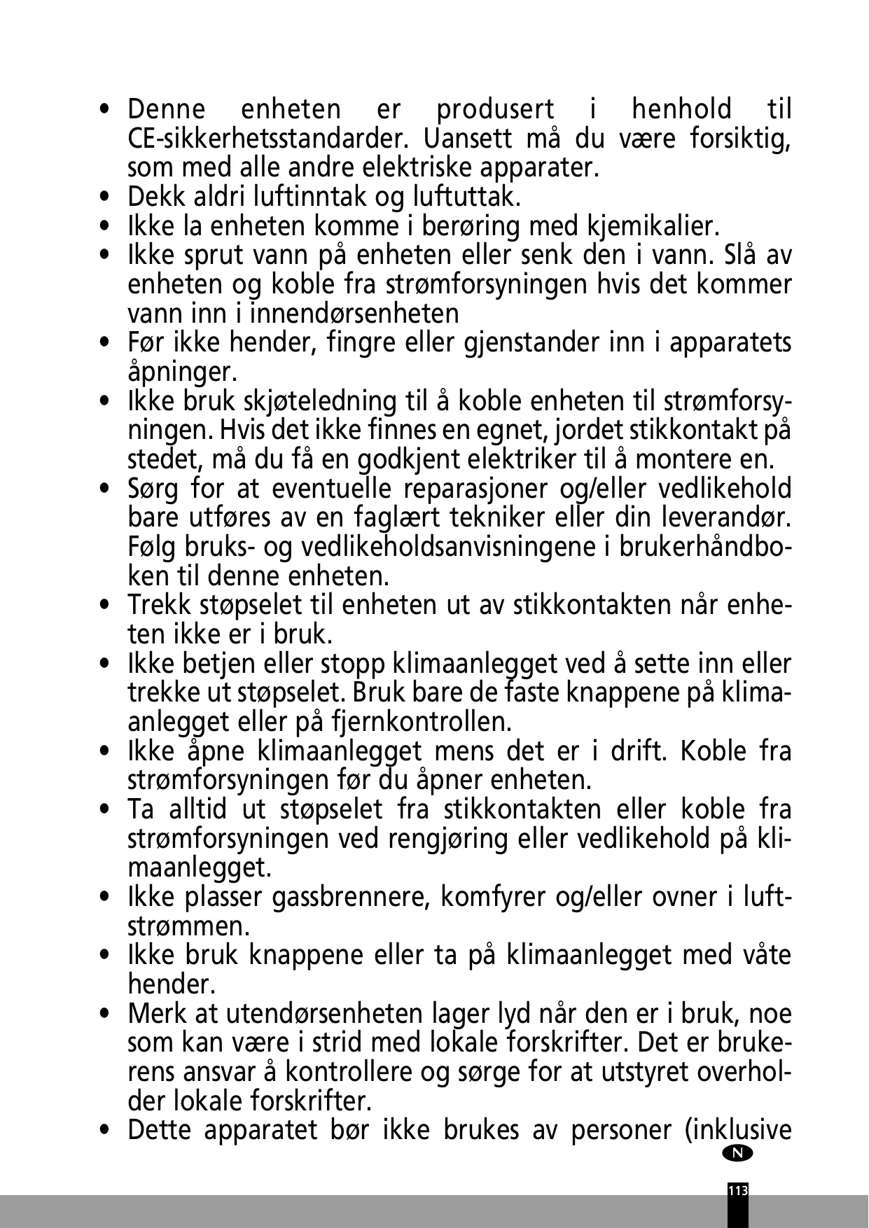 • Cet appareil n’est pas conçu pour des utilisateurs (y compris les enfants) qui présentent un handicap moteur, mental ou sensoriel, ou qui manquent d’expérience et de connaissances, sauf s’ils sont surveillés par une personne responsable de leur sécurité. • Surveillez les enfants présents, ils ne doivent en aucun cas jouer avec l’appareil. • Il est recommandé de ne pas rester dans la trajectoire du flux d’air. • Ne buvez jamais l’eau de condensation du climatiseur. • N’apporter aucune modification à l’appareil. • Si le câble d’alimentation est endommagé, il doit être remplacé par le fabricant, son service après vente ou des personnes de qualification similaire afin d’éviter un danger. • Cet appareil peut être utilisé par des enfants de plus de 8 ans et des personnes aux capacités physiques, sensorielles ou mentales réduites, ou manquant d’expérience et de connaissances ; il faut pour cela leur avoir fourni un encadrement ou des consignes à propos de l’utilisation sécurisée de l’appareil et leur avoir expliqué clairement les dangers potentiels. Ne pas laisser les enfants jouer avec l’appareil. Les enfants ne doivent pas être chargés du nettoyage et de l’entretien de l’appareil sauf s’ils sont encadrés. ATTENTION! • N’utilisez jamais l’appareil si le cordon électrique, la fiche électrique, le caisson ou le tableau de contrôle sont endommagés. • Le non respect des instructions peut mener à une annulation de la garantie de l’appareil. 3 48