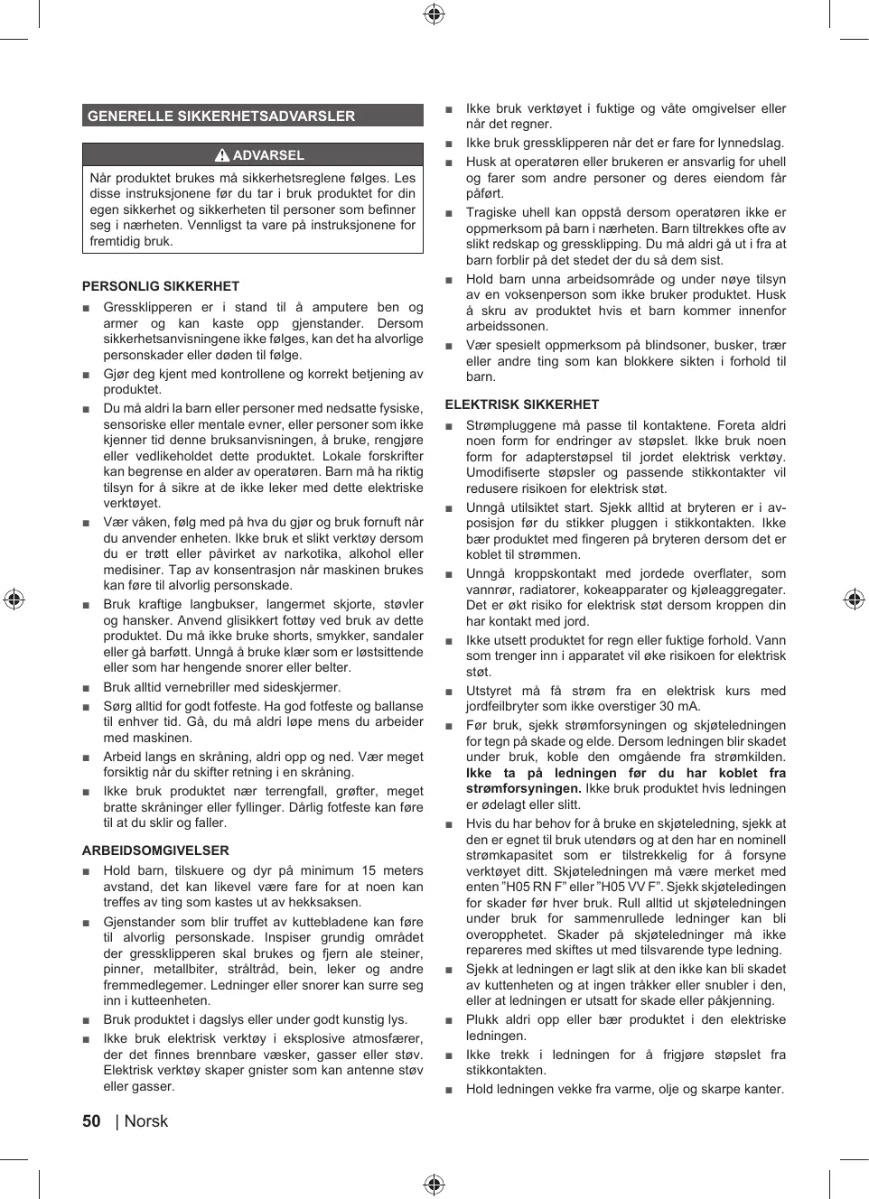 Gressklipperen er i stand til å amputere ben og armer og kan kaste opp gjenstander. Dersom sikkerhetsanvisningene ikke følges, kan det ha alvorlige personskader eller døden til følge. Gjør deg kjent med kontrollene og korrekt betjening av produktet. Du må aldri la barn eller personer med nedsatte fysiske, sensoriske eller mentale evner, eller personer som ikke kjenner tid denne bruksanvisningen, å bruke, rengjøre eller vedlikeholdet dette produktet. Lokale forskrifter kan begrense en alder av operatøren. Barn må ha riktig tilsyn for å sikre at de ikke leker med dette elektriske verktøyet. Vær våken, følg med på hva du gjør og bruk fornuft når du anvender enheten. Ikke bruk et slikt verktøy dersom du er trøtt eller påvirket av narkotika, alkohol eller medisiner. Tap av konsentrasjon når maskinen brukes kan føre til alvorlig personskade. Bruk kraftige langbukser, langermet skjorte, støvler og hansker. Anvend glisikkert fottøy ved bruk av dette produktet. Du må ikke bruke shorts, smykker, sandaler eller gå barføtt. Unngå å bruke klær som er løstsittende eller som har hengende snorer eller belter. Bruk alltid vernebriller med sideskjermer. Sørg alltid for godt fotfeste. Ha god fotfeste og ballanse til enhver tid. Gå, du må aldri løpe mens du arbeider med maskinen. Arbeid langs en skråning, aldri opp og ned. Vær meget forsiktig når du skifter retning i en skråning. Ikke bruk produktet nær terrengfall, grøfter, meget bratte skråninger eller fyllinger. Dårlig fotfeste kan føre til at du sklir og faller.