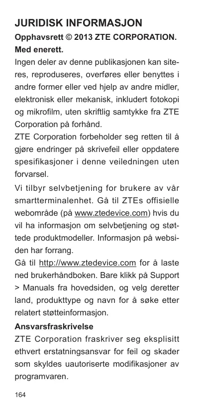 JURIDISK INFORMASJON Opphavsrett © 2013 ZTE CORPORATION. Med enerett. Ingen deler av denne publikasjonen kan siteres, reproduseres, overføres eller benyttes i andre former eller ved hjelp av andre midler, elektronisk eller mekanisk, inkludert fotokopi og mikrofilm, uten skriftlig samtykke fra ZTE Corporation på forhånd. ZTE Corporation forbeholder seg retten til å gjøre endringer på skrivefeil eller oppdatere spesifikasjoner i denne veiledningen uten forvarsel. Vi tilbyr selvbetjening for brukere av vår smartterminalenhet. Gå til ZTEs offisielle webområde (på www.ztedevice.com) hvis du vil ha informasjon om selvbetjening og støttede produktmodeller. Informasjon på websiden har forrang. Gå til http://www.ztedevice.com for å laste ned brukerhåndboken. Bare klikk på Support > Manuals fra hovedsiden, og velg deretter land, produkttype og navn for å søke etter relatert støtteinformasjon. Ansvarsfraskrivelse ZTE Corporation fraskriver seg eksplisitt ethvert erstatningsansvar for feil og skader som skyldes uautoriserte modifikasjoner av programvaren.