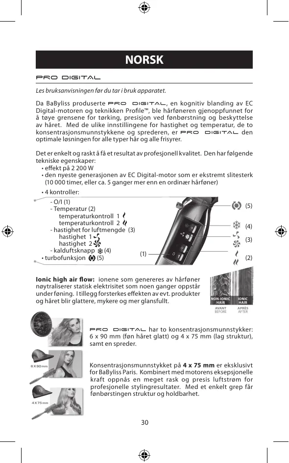 PRO DIGITAL est LA solution optimale pour tous les types de cheveux et toutes les coiffures. Son utilisation est simple et rapide pour un résultat de qualité professionnelle. Il est doté des caractéristiques techniques suivantes : • une puissance de 2200W • un moteur EC Digital nouvelle génération, d’une durée de vie exceptionnelle (10 000 heures, soit 5x plus qu’un sèche-cheveux AC) • 4 interrupteurs : - O/I (1) - températures (2) température position 1 température position 2 Le
