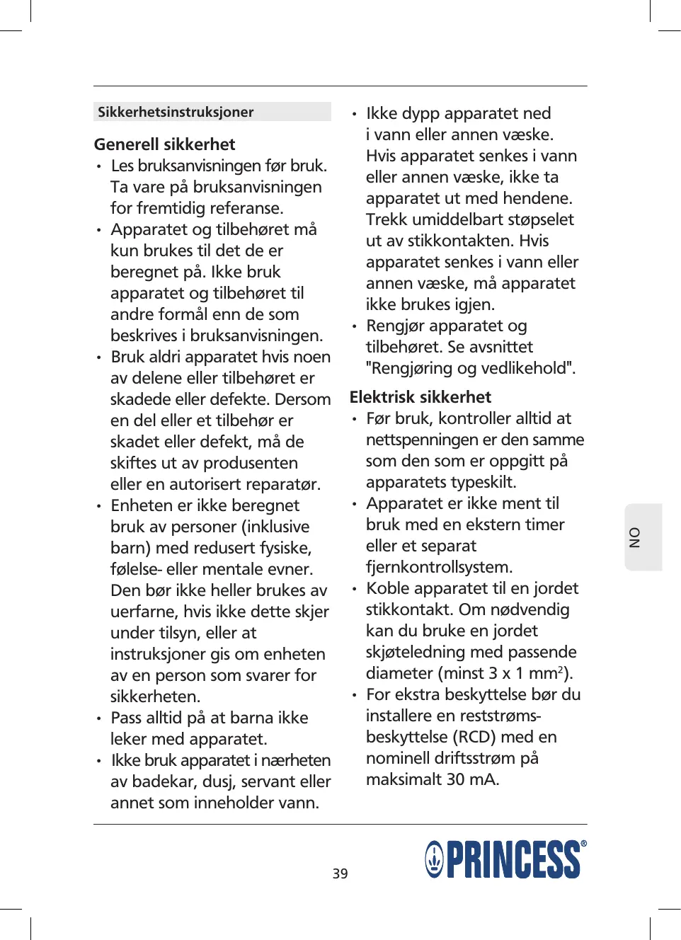 Generell sikkerhet • Les bruksanvisningen før bruk. Ta vare på bruksanvisningen for fremtidig referanse. • Apparatet og tilbehøret må kun brukes til det de er beregnet på. Ikke bruk apparatet og tilbehøret til andre formål enn de som beskrives i bruksanvisningen. • Bruk aldri apparatet hvis noen av delene eller tilbehøret er skadede eller defekte. Dersom en del eller et tilbehør er skadet eller defekt, må de skiftes ut av produsenten eller en autorisert reparatør. • Enheten er ikke beregnet bruk av personer (inklusive barn) med redusert fysiske, følelse- eller mentale evner. Den bør ikke heller brukes av uerfarne, hvis ikke dette skjer under tilsyn, eller at instruksjoner gis om enheten av en person som svarer for sikkerheten. • Pass alltid på at barna ikke leker med apparatet. • Ikke bruk apparatet i nærheten av badekar, dusj, servant eller annet som inneholder vann.