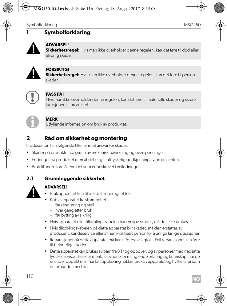 MSG150 Les bruksanvisningen nøye før du monterer og tar apparatet i bruk, og ta vare på den. Hvis produktet selges videre, må du sørge for å gi bruksanvisningen videre også.