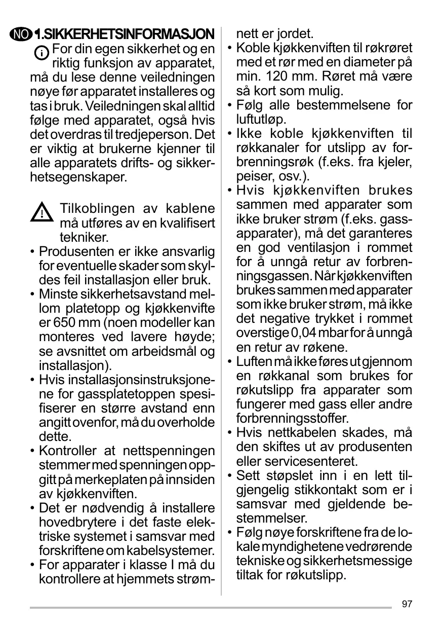 • Pour les appareils de Classe I, s’assurer que l’installation électrique de votre intérieur dispose d’une mise à la terre adéquate. Reliez l’aspirateur du conduit de cheminée avec un tube ayant un diamètre minimum de 120 mm. Le parcours des fumées doit être le plus court possible. Respecter toutes les normes concernant l’évacuation de l’air. Ne reliez pas la hotte aspirante aux conduits de cheminée qui acheminent les fumées de combustion (par ex. de chaudières, de cheminées, etc.). Si vous utilisez l’aspirateur en même temps que des appareils non électriques (par ex. fonctionnant au gaz), veillez à ce que la pièce soit adéquatement ventilée, afin d’empêcher le retour du flux des gaz d’évacuation. Si vous utilisez la hotte de cuisine en même temps que des appareils non alimentés à l’électricité, la pression négative dans la pièce ne doit pas dépasser 0,04 mbar, afin d’éviter que les fumées soient réaspirées dans la pièce où se trouve la hotte. Ne pas évacuer l’air à travers 15