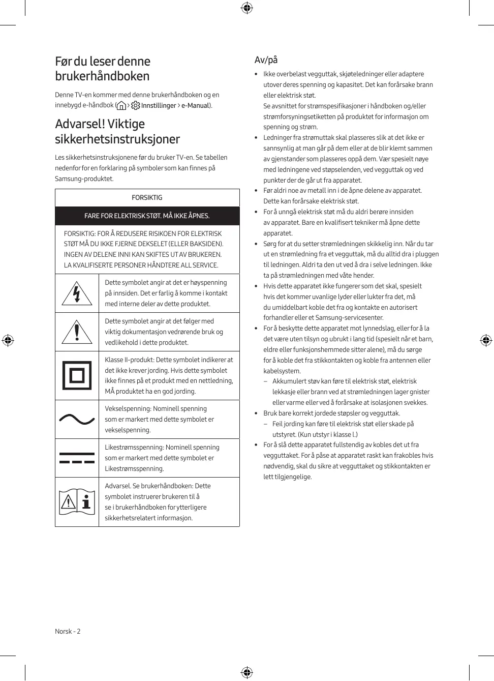 - • Ledninger fra strømuttak skal plasseres slik at det ikke er sannsynlig at man går på dem eller at de blir klemt sammen Les sikkerhetsinstruksjonene før du bruker TV-en. Se tabellen av gjenstander som plasseres oppå dem. Vær spesielt nøye nedenfor for en forklaring på symboler som kan finnes på med ledningene ved støpselenden, ved vegguttak og ved Samsung-produktet. punkter der de går ut fra apparatet. FORSIKTIG FARE FOR ELEKTRISK STØT. MÅ IKKE ÅPNES.