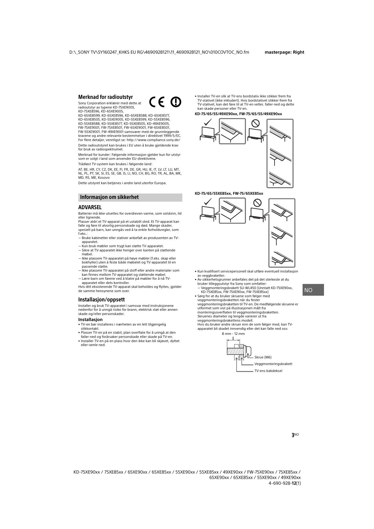 - Det anbefales på det sterkeste at du bruker en veggmonteringsbrakett som er godkjent av Sony for å oppnå tilstrekkelig luftsirkulasjon. Montering på vegg 30 cm 10 cm 10 cm 8 mm - 12 mm 10 cm La det være minst så mye plass rundt TV-apparatet. Installering med sokkel M6-skrue (tidligere fjernet) 30 cm 10 cm 10 cm 6 cm La det være minst så mye plass rundt TV-apparatet. Stropp (medfølger ikke) Skrue (medfølger ikke) 4NO KD-75XE90xx / 75XE85xx / 65XE90xx / 65XE85xx / 55XE90xx / 55XE85xx / 49XE90xx / FW-75XE90xx / 75XE85xx / 65XE90xx / 65XE85xx / 55XE90xx / 49XE90xx 4-690-928-12(1) D:\_SONY TV\SY160247_KHKS EU RG\4690928121\11_4690928121_NO\010COVTOC_NO.fm