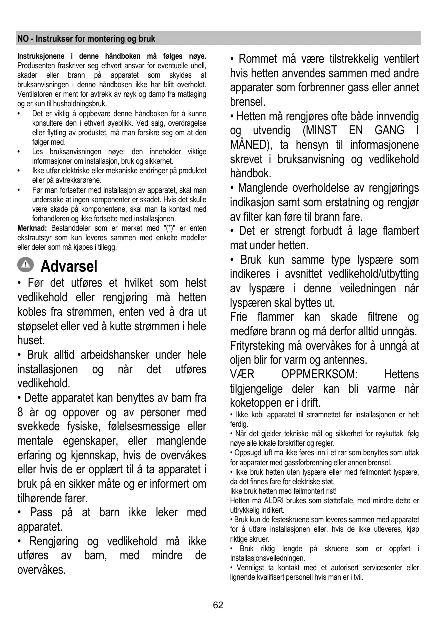 • Para la sustitución de la lámpara sólo utilizar el tipo de lámpara indicado en la sección de mantenimiento/sustitución de este manual. El uso de una llama libre es perjudicial para los filtros y puede provocar incendios, por lo tanto, debe evitarse en cualquier caso. Los fritos debe realizarse con cuidado para evitar que el aceite caliente prenda fuego. ATENCIÓN: Cuando la placa de cocción está funcionando las partes accesibles de la campana pueden calentarse.