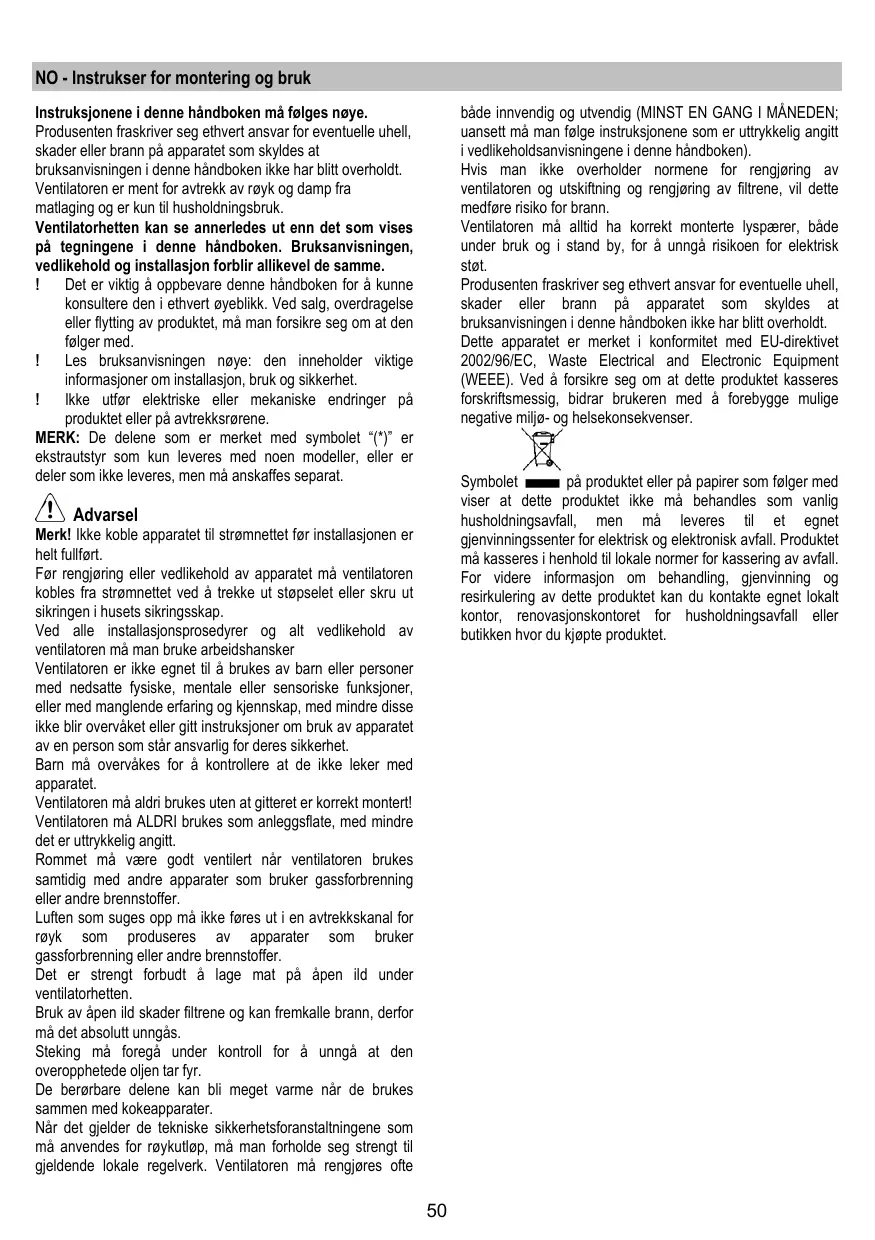NO - Instrukser for montering og bruk både innvendig og utvendig (MINST EN GANG I MÅNEDEN; uansett må man følge instruksjonene som er uttrykkelig angitt i vedlikeholdsanvisningene i denne håndboken). Hvis man ikke overholder normene for rengjøring av ventilatoren og utskiftning og rengjøring av filtrene, vil dette medføre risiko for brann. Ventilatoren må alltid ha korrekt monterte lyspærer, både under bruk og i stand by, for å unngå risikoen for elektrisk støt. Produsenten fraskriver seg ethvert ansvar for eventuelle uhell, skader eller brann på apparatet som skyldes at bruksanvisningen i denne håndboken ikke har blitt overholdt. Dette apparatet er merket i konformitet med EU-direktivet 2002/96/EC, Waste Electrical and Electronic Equipment (WEEE). Ved å forsikre seg om at dette produktet kasseres forskriftsmessig, bidrar brukeren med å forebygge mulige negative miljø- og helsekonsekvenser. Instruksjonene i denne håndboken må følges nøye. Produsenten fraskriver seg ethvert ansvar for eventuelle uhell, skader eller brann på apparatet som skyldes at bruksanvisningen i denne håndboken ikke har blitt overholdt. Ventilatoren er ment for avtrekk av røyk og damp fra matlaging og er kun til husholdningsbruk. Ventilatorhetten kan se annerledes ut enn det som vises på tegningene i denne håndboken. Bruksanvisningen, vedlikehold og installasjon forblir allikevel de samme. Det er viktig å oppbevare denne håndboken for å kunne konsultere den i ethvert øyeblikk. Ved salg, overdragelse eller flytting av produktet, må man forsikre seg om at den følger med. Les bruksanvisningen nøye: den inneholder viktige informasjoner om installasjon, bruk og sikkerhet. Ikke utfør elektriske eller mekaniske endringer på produktet eller på avtrekksrørene. MERK: De delene som er merket med symbolet “(*)” er ekstrautstyr som kun leveres med noen modeller, eller er deler som ikke leveres, men må anskaffes separat. Symbolet på produktet eller på papirer som følger med viser at dette produktet ikke må behandles som vanlig husholdningsavfall, men må leveres til et egnet gjenvinningssenter for elektrisk og elektronisk avfall. Produktet må kasseres i henhold til lokale normer for kassering av avfall. For videre informasjon om behandling, gjenvinning og resirkulering av dette produktet kan du kontakte egnet lokalt kontor, renovasjonskontoret for husholdningsavfall eller butikken hvor du kjøpte produktet. Advarsel Merk! Ikke koble apparatet til strømnettet før installasjonen er helt fullført. Før rengjøring eller vedlikehold av apparatet må ventilatoren kobles fra strømnettet ved å trekke ut støpselet eller skru ut sikringen i husets sikringsskap. Ved alle installasjonsprosedyrer og alt vedlikehold av ventilatoren må man bruke arbeidshansker Ventilatoren er ikke egnet til å brukes av barn eller personer med nedsatte fysiske, mentale eller sensoriske funksjoner, eller med manglende erfaring og kjennskap, med mindre disse ikke blir overvåket eller gitt instruksjoner om bruk av apparatet av en person som står ansvarlig for deres sikkerhet. Barn må overvåkes for å kontrollere at de ikke leker med apparatet. Ventilatoren må aldri brukes uten at gitteret er korrekt montert! Ventilatoren må ALDRI brukes som anleggsflate, med mindre det er uttrykkelig angitt. Rommet må være godt ventilert når ventilatoren brukes samtidig med andre apparater som bruker gassforbrenning eller andre brennstoffer. Luften som suges opp må ikke føres ut i en avtrekkskanal for røyk som produseres av apparater som bruker gassforbrenning eller andre brennstoffer. Det er strengt forbudt å lage mat på åpen ild under ventilatorhetten. Bruk av åpen ild skader filtrene og kan fremkalle brann, derfor må det absolutt unngås. Steking må foregå under kontroll for å unngå at den overopphetede oljen tar fyr. De berørbare delene kan bli meget varme når de brukes sammen med kokeapparater. Når det gjelder de tekniske sikkerhetsforanstaltningene som må anvendes for røykutløp, må man forholde seg strengt til gjeldende lokale regelverk. Ventilatoren må rengjøres ofte