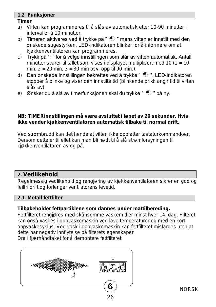 NB: TIMERinnstillingen på vår avsluttet i lopet av 20 sekunder. Hvis ikke vender kjøkkenventilatoren automatisk tilbake til normal drift.