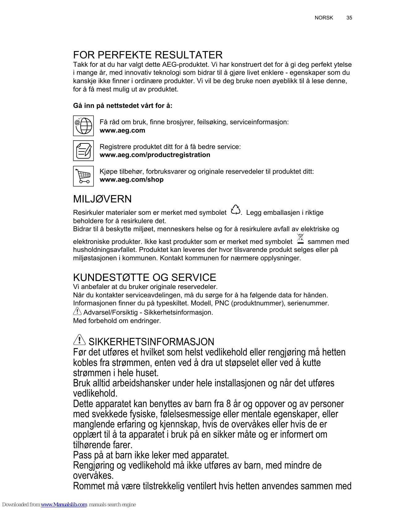Avant toute opération de nettoyage ou d’entretien, débranchez l’alimentation électrique en retirant la fiche ou en coupant l’interrupteur général. Utilisez de gants de travail pour toute opération de nettoyage ou d’entretien. L’appareil peut être utilisé par les enfants âgés pas moins de 8 ans et les personnes ayant des capacités réduites physiques, sensorielles ou mentales, ou sans l’expérience ou les connaissances nécessaires, uniquement sous surveillance ou après ils ont reçu des instructions relatives à l’utilisation en sécurité de l’appareil et ont compris les dangers inhérents. Les enfants doivent être surveillés pour s’assurer qu’ils ne jouent pas avec l’appareil. Le nettoyage et l’entretien ne doivent pas être effectués par des enfants sans surveillance. La pièce doit avoir une aération suffisante lorsque la hotte est utilisée conjointement avec d’autres appareils fonctionnant au gaz ou autres combustibles. Downloaded from www.Manualslib.com manuals search engine