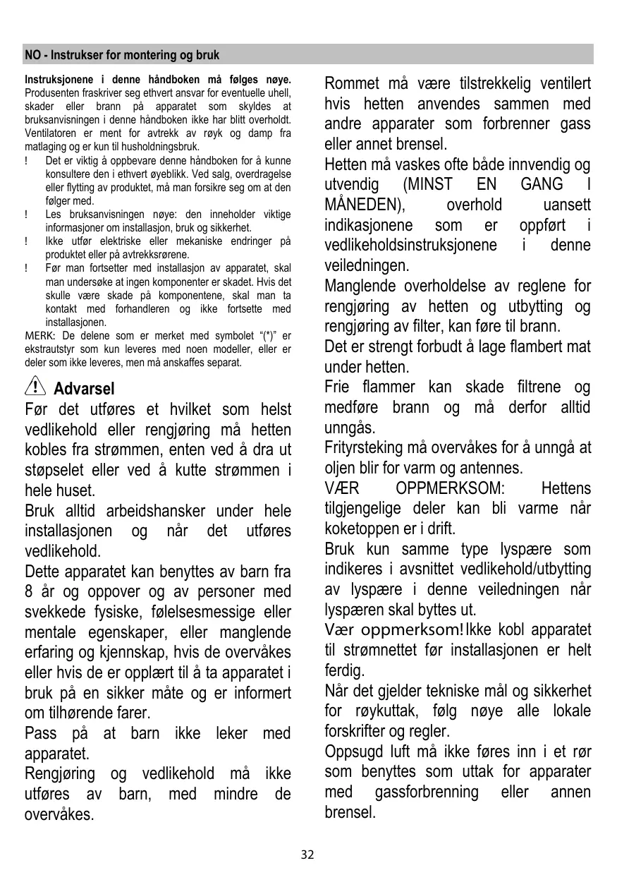 Advarsel Før det utføres et hvilket som helst vedlikehold eller rengjøring må hetten kobles fra strømmen, enten ved å dra ut støpselet eller ved å kutte strømmen i hele huset. Bruk alltid arbeidshansker under hele installasjonen og når det utføres vedlikehold. Dette apparatet kan benyttes av barn fra 8 år og oppover og av personer med svekkede fysiske, følelsesmessige eller mentale egenskaper, eller manglende erfaring og kjennskap, hvis de overvåkes eller hvis de er opplært til å ta apparatet i bruk på en sikker måte og er informert om tilhørende farer. Pass på at barn ikke leker med apparatet. Rengjøring og vedlikehold må ikke utføres av barn, med mindre de overvåkes. 32