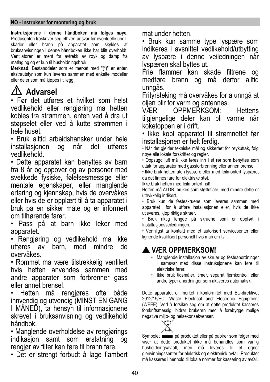 Instruksjonene i dette handboken på folges nøye. Produsenten fraskriver seg ethvert ansvar for eventuelle uhell, skader eller brann på apparatet som skyldes at braupsanvisingen i dette handboken ikke har blitt overholdt. Ventilatoren er ment for avtrekk av røyk og damp fra matlaging og er kun til husholdningsbruk.