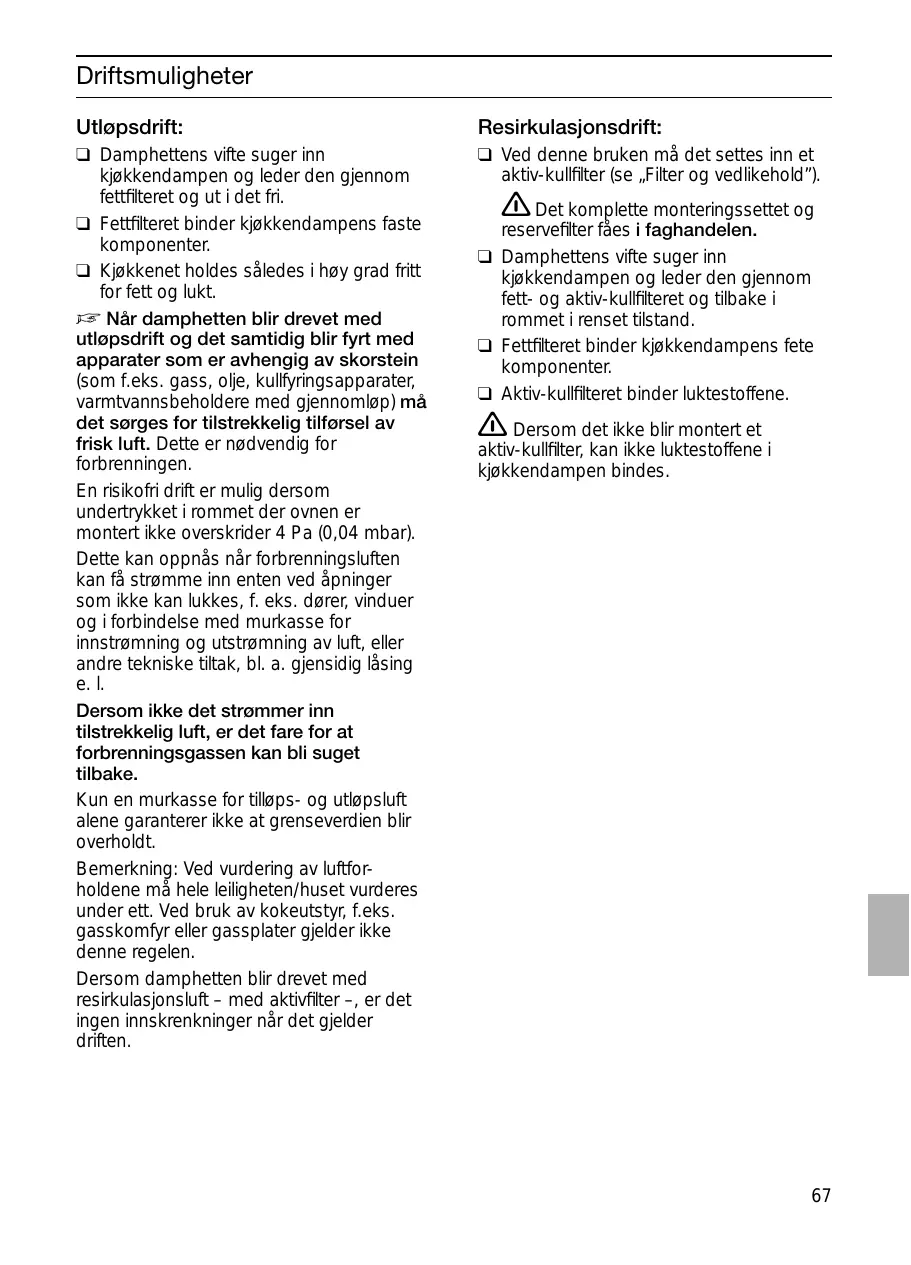 ❑ Ce filtre retient les particules grasses solides en suspension dans les buées de cuisson. ❑ Les particules grasses ne se déposent plus dans la cuisine, les odeurs de cuisson disparaissent. D Si la hotte évacue l'air à l'extérieur et si le logement comporte des moyens de chauffage (tels par ex. des appareils de chauffage au gaz, au fuel ou au charbon, chauffe-eau instantanés ou à accumulation) raccordés à une cheminée, veiller impérativement à ce que l'apport d'air soit suffisant pour assurer la marche du chauffage à combustion. Un fonctionnement sans risque est possible si la dépression dans le local où le foyer de chauffage est implanté ne dépasse pas 4 Pascals (0,04 mbars).On y parvient en présence d'ouvertures non obturables ménagées par ex. dans les portes, fenêtres et en association avec des ventouses télescopiques d'admission/ évacuation de l'air à travers la maçonnerie ou par d'autres mesures techniques telles qu'un verrouillage réciproque ou assimilé permettant à l'air d'affluer pour assurer la combustion. En cas d'afflux d'air insuffisant, risque d'intoxication par réaspiration des gaz de combustion. La présence d'une ventouse télescopique d'apport et d'évacuation d'air ne suffit pas à assurer le respect de la valeur limite. Remarque: lors de l'évaluation de la situation, toujours tenir compte de l'ensemble des moyens d'aération du logement. Cette règle ne vaut généralement pas si vous utilisez des appareils de cuisson (table de cuisson et cuisinière à gaz). Si la hotte recycle l'air aspiré au moyen d'un filtre au charbon actif, son fonctionnement ne s'assortit d'aucune restriction.