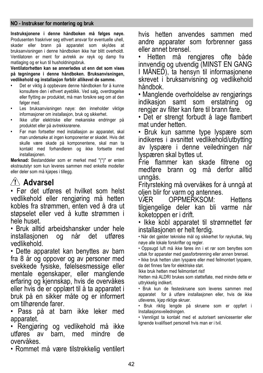 • L’air ne doit pas être envoyé dans un conduit utilisé pour évacuer les fumées d’appareils utilisant du gaz ou un autre combustible. • Ne pas utiliser ou laisser la hotte sans les lampes correctement montées, car un éventuel risque de choc électrique est possible. • N’utilisez jamais la hotte sans la grille montée correctement! • La hotte ne doit JAMAIS être utilisée comme une surface d'appui, sauf indication expresse.