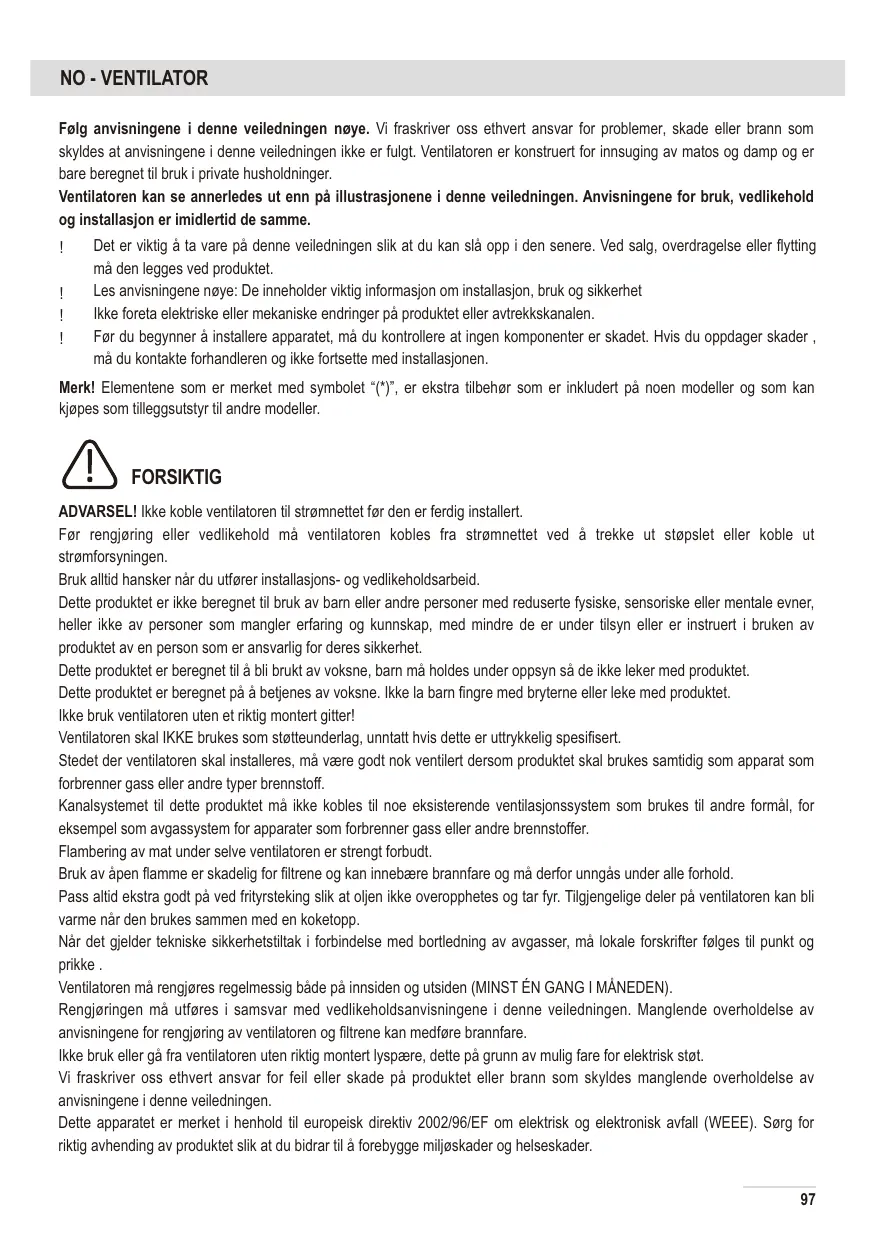 Avant toute opération de nettoyage ou d'entretien, mettez la hotte hors tension en débranchant la prise secteur ou, en cas de raccordement permanent, en désarmant le disjoncteur. Mettez des gants de protection avant d'effectuer toute opération d'installation et d'entretien. Cet appareil n'est pas prévu pour les enfants ou les personnes à capacités physiques, sensorielles ou mentales réduites ou manquant d'expérience et de connaissances. Elles ne pourront l'utiliser que sous la surveillance d'un adulte responsable de leur sécurité et après avoir été mises au courant de son fonctionnement. La hotte est prévue pour des adultes. Surveillez les enfants afin qu'ils ne jouent pas avec l'appareil ou avec ses commandes. Ne mettez jamais la hotte en marche si la grille n'est pas bien en place. Ne déposez AUCUN objet sur la hotte sauf si cela est expressément autorisé. Quand la hotte fonctionne en même temps que d'autres appareils à gaz ou autres combustibles, la cuisine doit disposer d'une ventilation suffisante. L'air aspiré par la hotte ne doit jamais être expulsé dans le conduit d'évacuation des fumées de combustion dégagées par des appareils fonctionnant au gaz ou autres combustibles. Il est formellement interdit de flamber les aliments sous la hotte. Évitez de laisser brûler une flamme nue sous la hotte, car cela peut endommager les filtres et provoquer un incendie. Surveillez vos fritures en permanence, car la graisse ou l'huile surchauffée peut prendre feu. Les parties accessibles de la hotte peuvent devenir assez chaudes quand les appareils de cuisson sont en marche. En ce qui concerne les mesures techniques de sécurité pour l'évacuation des fumées, respectez strictement les réglementations et normes en vigueur dans votre pays. La hotte doit être régulièrement nettoyée, aussi bien à l'intérieur qu'à l'extérieur (AU MOINS UNE FOIS PAR MOIS), et ceci en respectant les instructions d'entretien fournies dans ce manuel. Le non-respect des consignes concernant le nettoyage de la hotte ainsi que le remplacement et le nettoyage des filtres peut entraîner un risque d'incendie. Afin d'éviter tout risque de choc électrique, n'utilisez pas la hotte si les lampes ne sont pas bien en place. Nous déclinons toute responsabilité pour tout dysfonctionnement, dommage ou incendie résultant du non-respect des consignes figurant dans cette notice.