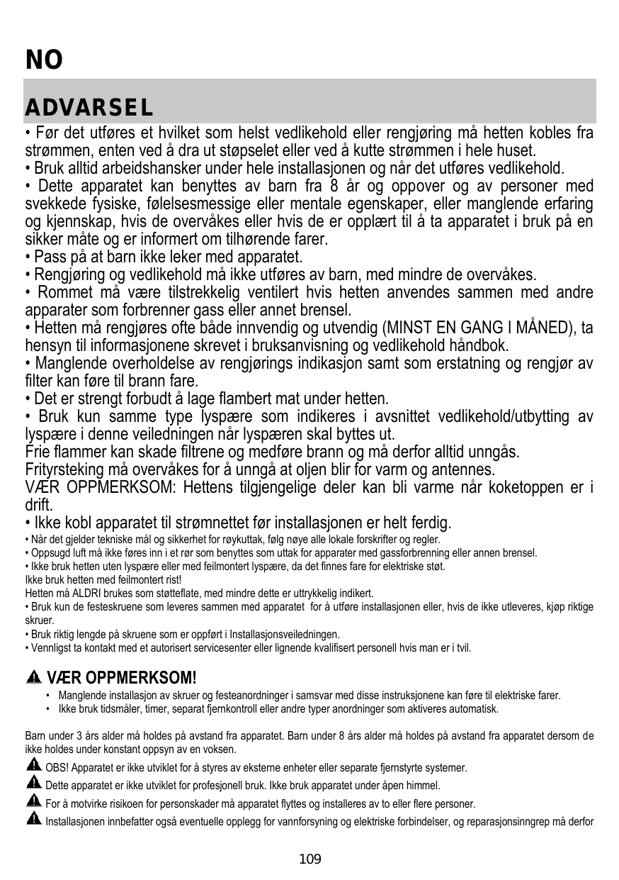 • Les enfants ne doivent pas jouer avec l’appareil. • Le nettoyage et l’entretien par l’usager ne doivent pas être effectués par des enfants sans surveillance. • La pièce doit avoir une aération suffisante lorsque la hotte est utilisée conjointement avec d'autres appareils fonctionnant au gaz ou autres combustibles. • La hotte doit être régulièrement nettoyée à la fois à l'intérieur et à l'extérieur (AU MOINS UNE FOIS PAR MOIS); cela devrait se faire en conformité avec les instructions d'entretien. Le non respect des instructions expressément fournies concernant le nettoyage de la hotte et des filtres peut provoquer des risques d'incendie. • Ne pas flamber d’aliments sous la hotte. • Pour le remplacement de la lampe, utilisez uniquement le type de lampe spécifié dans la section remplacement/maintenance lampe dans ce manuel. L'utilisation d'une flamme nue est dommageable pour les filtres et peut causer un incendie, par conséquent, il est déconseillé de l'utiliser. La friture doit être faite avec soin afin de s’assurer que l’huile surchauffée ne prenne pas feu. AVERTISSEMENT: Lorsque la table de cuisson est en fonctionnement, les parties accessibles de la hotte peuvent devenir très chaudes. • Ne pas brancher l'appareil au réseau électrique avant que l'installation ne soit complètement terminée. • En ce qui concerne les mesures techniques et de sécurité à prendre pour l'évacuation des fumées, respectez strictement les dispositions des règlements locales. • L’air ne doit pas être envoyé dans un conduit utilisé pour évacuer les fumées d’appareils utilisant du gaz ou un autre combustible. • Ne pas utiliser ou laisser la hotte sans les lampes correctement montées, car un éventuel risque de choc électrique est possible. • N’utilisez jamais la hotte sans la grille montée correctement! • La hotte ne doit JAMAIS être utilisée comme une surface d'appui, sauf indication expresse. • Utilisez uniquement les vis de fixation fournies avec le produit pour l'installation, ou, si non fournies, acheter le type correct de vis. • Utilisez la longueur correcte pour les vis qui sont identifiées dans le Guide d'installation. • En cas de doute, consultez votre centre de service agréé ou du personnel qualifié.