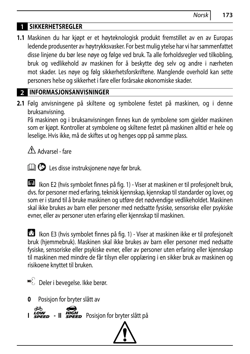 EN 62233; EN 50581 Sen henkilön nimi ja osoite, joka on valtuutettu kokoamaan teknisen eritelmän: Stefano Reverberi / AR Toimitusjohtaja Via M.L. King 3 - 41122 Modena, Italia Direktiivissä 2000/14/EY vaadittu vaatimustenmukaisuuden arviointimenettely on toteutettu liitteen V mukaan. Mallinro 2.1 Respecter les pictogrammes de sécurité et les symboles figurant sur l'appareil et dans ce manuel. Seuls les symboles concernant l'appareil acheté sont reproduits sur l'appareil et dans le manuel. S'assurer que les symboles et les pictogrammes de sécurité sur l'appareil sont lisibles et en bon état. Dans le cas contraire, les remplacer en respectant la position d'origine. Attention - Danger Lire attentivement ces instructions avant emploi. Icône E2 (si le symbole est présent sur fig. 1) - Elle indique que l'appareil est conçu pour un usage professionnel, c'est-à-dire pour les personnes qui ont de l'expérience, la connaissance technique, normative, législative et qui sont en mesure d'exécuter les opérations nécessaires à l'utilisation et à la maintenance de l'appareil. Cet appareil ne doit pas être utilisé par des personnes (enfants inclus) dont les capacités physiques, sensorielles ou mentales sont réduites, ou par des personnes sans expérience ni formation. Icône E3 (si le symbole est présent sur fig. 1) - Elle indique que l'appareil est conçu pour un usage non professionnel (domestique). Il peut être utilisé par des personnes aux capacités physiques, sensorielles ou mentales réduites, ou manquant d'expérience ou de connaissance, à partir du moment où elles sont surveillées ou ont reçu des explications permettant d'utiliser l'appareil en toute sécurité et comprennent les risques impliqués. Organes en mouvement. Ne pas toucher.