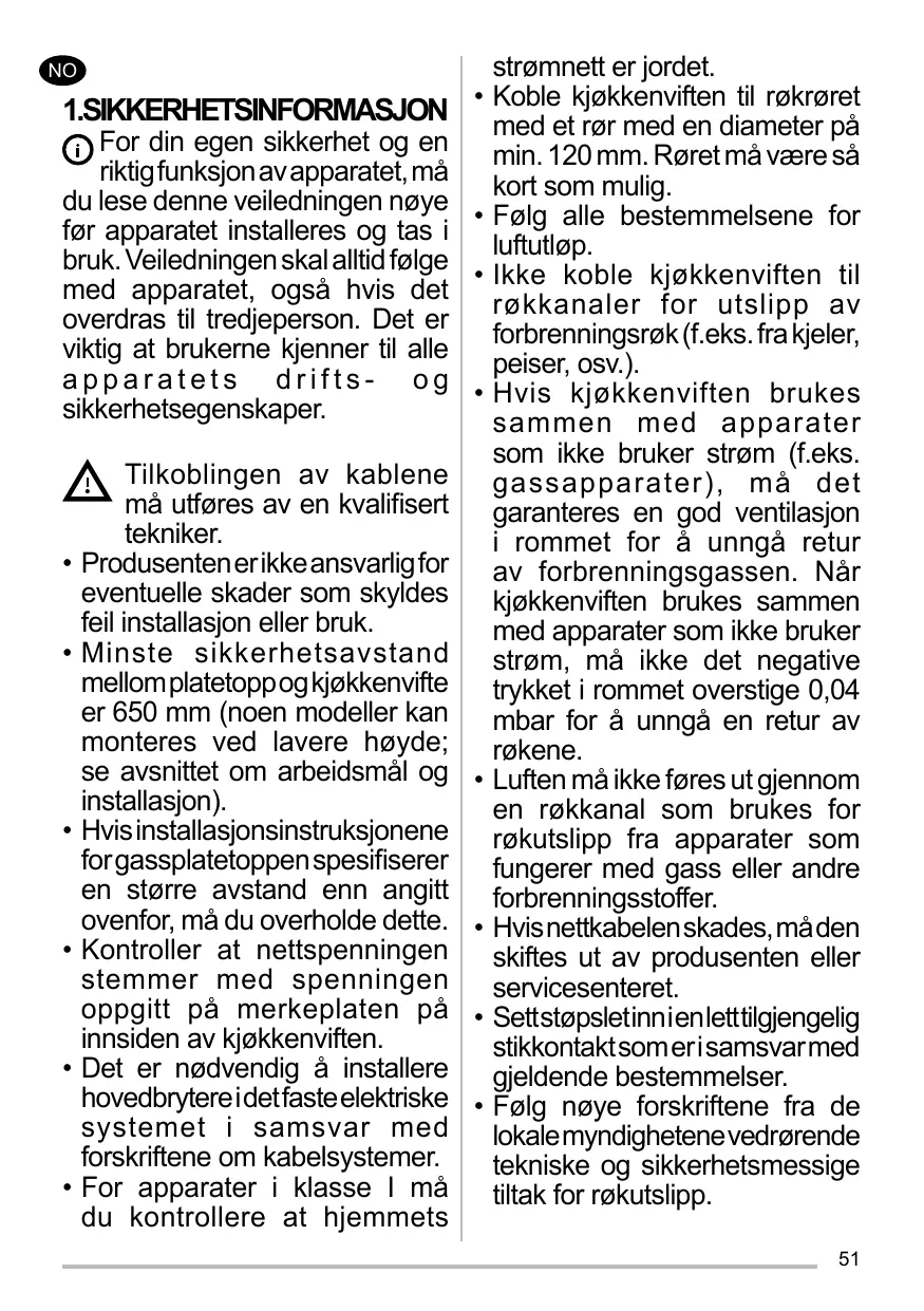 Lesdispositifsdesectionnement doivent être montés dans l’installation fixe conformément aux normes sur les systèmes de câblage. Pour les appareils de Classe I, s’assurer que l’installation électrique de votre intérieur dispose d’une mise à la terre adéquate. Reliez l’aspirateur du conduit de cheminée avec un tube ayant un diamètre minimum de 120 mm. Le parcours des fumées doit être le plus court possible. Respecter toutes les normes concernant l’évacuation de l’air. Ne reliez pas la hotte aspirante aux conduits de cheminée qui acheminent les fumées de combustion (par ex. de chaudières, de cheminées, etc.). Si vous utilisez l’aspirateur en même temps que des appareils non électriques (par ex. fonctionnant au gaz), veillez à ce que la pièce soit adéquatement ventilée, afin d’empêcher le retour du flux des gaz d’évacuation. Si vous utilisez la hotte de cuisine en même temps que des appareils non alimentés à l’électricité, la pression négative dans la pièce ne doit pas dépasser 0,04 mbar, 15