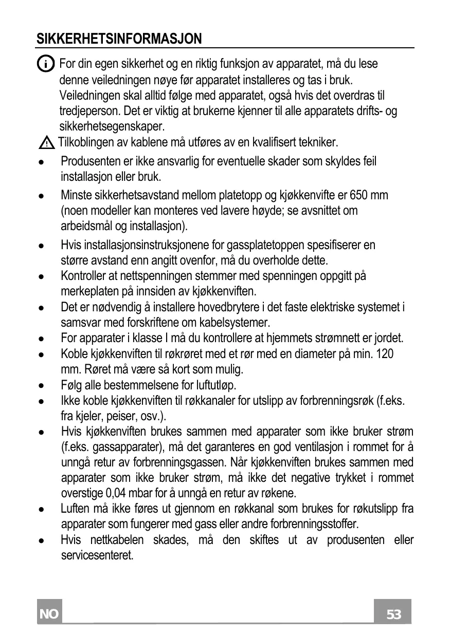 La connexion des câbles doit être effectuée par un technicien compétent. En aucun cas le fabricant ne peut être tenu pour responsable d’éventuels dommages dus à une installation ou à une utilisation impropre. La distance de sécurité minimum entre le plan de cuisson et la hotte aspirante est de 650 mm (certains modèles peuvent être installés à une hauteur inférieure ; voir le paragraphe concernant les dimensions de travail et l’installation). Si les instructions d’installation du plan de cuisson à gaz spécifient une distance supérieure à celle indiquée ci-dessus, veuillez impérativement en tenir compte. Assurez-vous que la tension du secteur correspond à celle indiquée sur la plaque des caractéristiques apposée à l’intérieur de la hotte. Les dispositifs de sectionnement doivent être montés dans l’installation fixe conformément aux normes sur les systèmes de câblage. Pour les appareils de Classe I, s’assurer que l’installation électrique de votre intérieur dispose d’une mise à la terre adéquate. Reliez l’aspirateur du conduit de cheminée avec un tube ayant un diamètre minimum de 120 mm. Le parcours des fumées doit être le plus court possible. Respecter toutes les normes concernant l’évacuation de l’air. Ne reliez pas la hotte aspirante aux conduits de cheminée qui acheminent les fumées de combustion (par ex. de chaudières, de cheminées, etc.). Si vous utilisez l’aspirateur en même temps que des appareils non électriques (par ex. fonctionnant au gaz), veillez à ce que la pièce soit adéquatement ventilée, afin d’empêcher le retour du flux des gaz d’évacuation. Si vous utilisez la hotte de cuisine en même temps que des appareils non alimentés à l’électricité, la pression négative dans la pièce ne doit pas dépasser 0,04 mbar, afin d’éviter que les fumées soient réaspirées dans la pièce où se trouve la hotte.