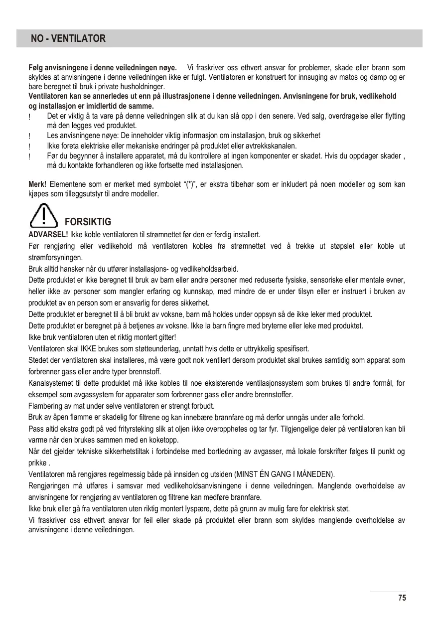 Avant toute opération de nettoyage ou d’entretien, mettez la hotte hors tension en débranchant la prise secteur ou, en cas de raccordement permanent, en désarmant le disjoncteur. Mettez des gants de protection avant d’effectuer toute opération d’installation et d’entretien. Cet appareil n’est pas prévu pour les enfants ou les personnes à capacités physiques, sensorielles ou mentales réduites ou manquant d’expérience et de connaissances. Elles ne pourront l’utiliser que sous la surveillance d'un adulte responsable de leur sécurité et après avoir été mises au courant de son fonctionnement. La hotte est prévue pour des adultes. Surveillez les enfants afin qu’ils ne jouent pas avec l’appareil ou avec ses commandes. Ne mettez jamais la hotte en marche si la grille n'est pas bien en place. Ne déposez AUCUN objet sur la hotte sauf si cela est expressément autorisé. Quand la hotte fonctionne en même temps que d'autres appareils à gaz ou autres combustibles, la cuisine doit disposer d'une ventilation suffisante. L'air aspiré par la hotte ne doit jamais être expulsé dans le conduit d’évacuation des fumées de combustion dégagées par des appareils fonctionnant au gaz ou autres combustibles. Il est formellement interdit de flamber les aliments sous la hotte. Évitez de laisser brûler une flamme nue sous la hotte, car cela peut endommager les filtres et provoquer un incendie. Surveillez vos fritures en permanence, car la graisse ou l’huile surchauffée peut prendre feu. Les parties accessibles de la hotte peuvent devenir assez chaudes quand les appareils de cuisson sont en marche. En ce qui concerne les mesures techniques de sécurité pour l'évacuation des fumées, respectez strictement les réglementations et normes en vigueur dans votre pays. La hotte doit être régulièrement nettoyée, aussi bien à l'intérieur qu'à l'extérieur (AU MOINS UNE FOIS PAR MOIS), et ceci en respectant les instructions d'entretien fournies dans ce manuel. Le non-respect des consignes concernant le nettoyage de la hotte ainsi que le remplacement et le nettoyage des filtres peut entraîner un risque d'incendie. Afin d'éviter tout risque de choc électrique, n'utilisez pas la hotte si les lampes ne sont pas bien en place. Nous déclinons toute responsabilité pour tout dysfonctionnement, dommage ou incendie résultant du non-respect des consignes figurant dans cette notice.