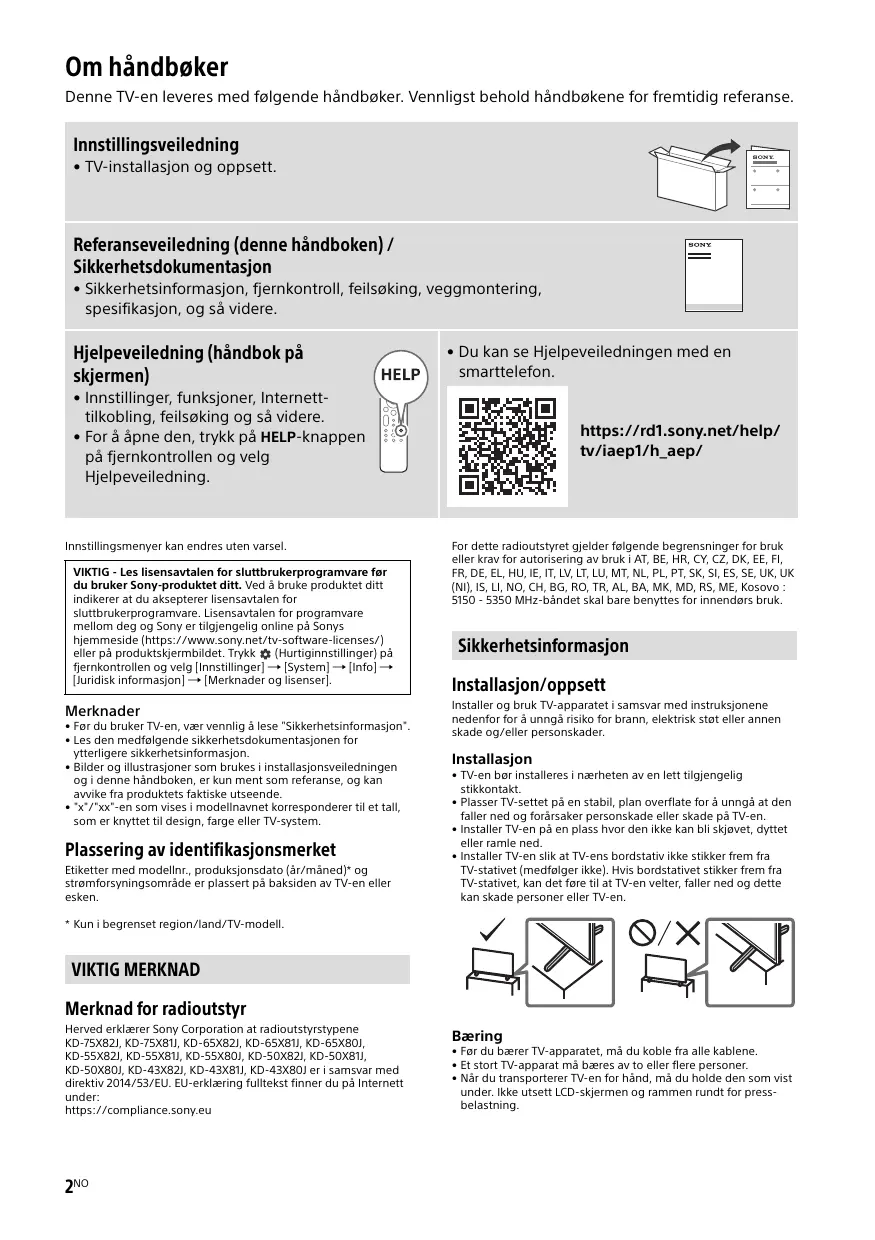 (RÈGLEMENT DÉLÉGUÉ (UE) 2019/2013 DE LA COMMISSION) KD-75X82J (403706), KD-75X81J (403705), KD-65X82J (403703), KD-65X81J (403702), KD-65X80J (403701), KD-55X82J (403698), Para obtener instrucciones acerca de la instalación del Soporte de pared, consulte la información de instalación (Soporte de pared) en la página del producto de su modelo de televisor. https://www.sony.eu/support • Siga la guía de instrucciones suministrada con el Soporte de pared correspondiente a su modelo. Para instalar este televisor, es necesario disponer de conocimientos suficientes, especialmente para determinar si la pared es lo bastante resistente para aguantar el peso del televisor.