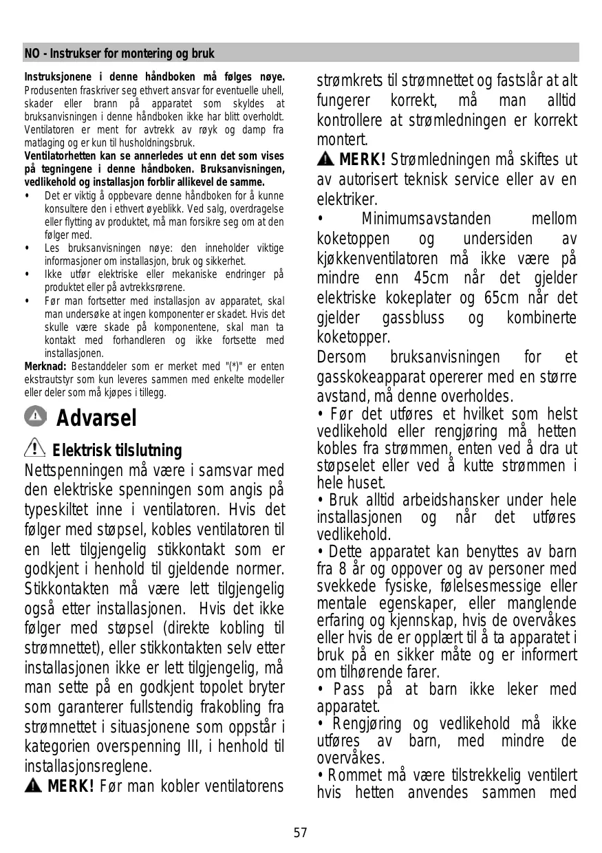 strømkrets til strømnettet og fastslår at alt fungerer korrekt, må man alltid kontrollere at strømledningen er korrekt montert. MERK! Strømledningen må skiftes ut av autorisert teknisk service eller av en elektriker. • Minimumsavstanden mellom koketoppen og undersiden av kjøkkenventilatoren må ikke være på mindre enn 45cm når det gjelder elektriske kokeplater og 65cm når det gjelder gassbluss og kombinerte koketopper. Dersom bruksanvisningen for et gasskokeapparat opererer med en større avstand, må denne overholdes. • Før det utføres et hvilket som helst vedlikehold eller rengjøring må hetten kobles fra strømmen, enten ved å dra ut støpselet eller ved å kutte strømmen i hele huset. • Bruk alltid arbeidshansker under hele installasjonen og når det utføres vedlikehold. • Dette apparatet kan benyttes av barn fra 8 år og oppover og av personer med svekkede fysiske, følelsesmessige eller mentale egenskaper, eller manglende erfaring og kjennskap, hvis de overvåkes eller hvis de er opplært til å ta apparatet i bruk på en sikker måte og er informert om tilhørende farer. • Pass på at barn ikke leker med apparatet. • Rengjøring og vedlikehold må ikke utføres av barn, med mindre de overvåkes. • Rommet må være tilstrekkelig ventilert hvis hetten anvendes sammen med