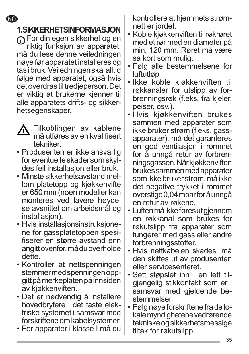 I, s’assurer que l’installation électrique de votre intérieur dispose d’une mise à la terre adéquate. Reliez l’aspirateur du conduit de cheminée avec un tube ayant un diamètre minimum de 120 mm. Le parcours des fumées doit être le plus court possible. Respecter toutes les normes concernant l’évacuation de l’air. Ne reliez pas la hotte aspirante aux conduits de cheminée qui acheminent les fumées de combustion (par ex. de chaudières, de cheminées, etc.). Si vous utilisez l’aspirateur en même temps que des appareils non électriques (par ex. fonctionnant au gaz), veillez à ce que la pièce soit adéquatement ventilée, afin d’empêcher le retour du flux des gaz d’évacuation. Si vous utilisez la hotte de cuisine en même temps que des appareils non alimentés à l’électricité, la pression négative dans la 11