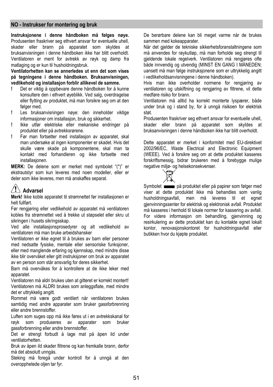 Suivre impérativement les instructions de cette notice. Le constructeur décline toute responsabilité pour tous les inconvénients, dommages ou incendies provoqués à l’appareil et dûs à la non observation des instructions de la présente notice. Cette hotte prévue pour l’aspiration des fumées et vapeurs de cuisson est destinée à un usage domestique exclusivement.