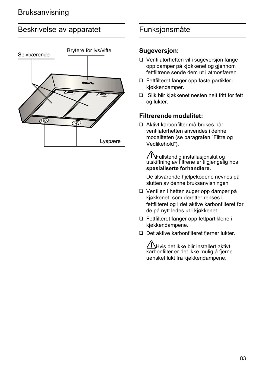 ❑ Aktivt karbonfilter må brukes når ventilatorhetten anvendes i denne modaliteten (se paragrafen ”Filtre og Vedlikehold”). Fullstendig installasjonskit og utskiftning av filtrene er tilgjengelig hos spesialiserte forhandlere. De tilsvarende hjelpekodene nevnes på slutten av denne bruksanvisningen ❑ Ventilen i hetten suger opp damper på kjøkkenet, som deretter renses i fettfilteret og i det aktive karbonfilteret før de på nytt ledes ut i kjøkkenet. ❑ Fettfilteret fanger opp fettpartiklene i kjøkkendampene. ❑ Det aktive karbonfilteret fjerner lukter. Hvis det ikke blir installert aktivt karbonfilter er det ikke mulig å fjerne uønsket lukt fra kjøkkendampene.