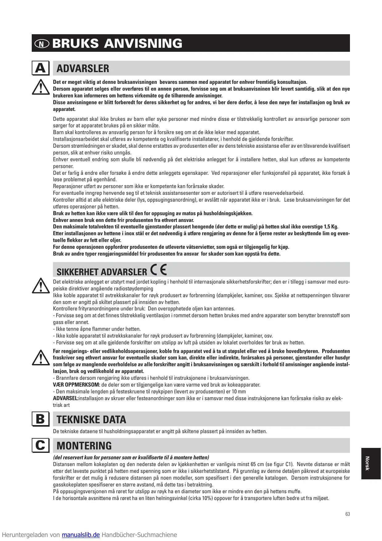 (partie réservée au personnel qualifié pour le branchement) ATTENTION! Toujours débrancher l’appareil avant de faire une opération quelconque à l’intérieur de la hotte. S’assurer qu’aucun fil n’est débranché ou coupé ; si c’est le cas, contacter le Service après-vente le plus proche. S’adresser à du personnel qualifié pour le branchement électrique. Les branchements doivent être effectués conformément aux dispositions de loi en vigueur. Vérifier si le disjoncteur et l’installation électrique peuvent supporter la charge de l’appareil (voir plaque des caractéristiques techniques au point B). Certains appareils peuvent être munis d’un câble sans fiche; la fiche à utiliser doit dans ce cas être de type «standardisé» en tenant compte que: - le fil jaune-vert doit être utilisé pour la mise à la terre; - le fil bleu doit être utilisé pour le neutre; - le fil marron doit être utilisé pour la phase, le câble ne doit pas être en contact avec les parties chaudes ayant une température supérieure à 70°C; - monter une fiche adaptée à la charge sur le câble d’alimentation et la brancher à une fiche de sécurité appropriée. Si un appareil fixe n’est pas muni d’un câble d’alimentation et d’une fiche, ou d’un autre dispositif pour le débrancher, avec une distance d’ouverture des contacts permettant la coupure de courant totale en cas de surtension, catégorie III, les instructions doivent indiquer que ces dispositifs de coupure doivent être prévus dans le réseau d’alimentation, conformément aux règles d’installation. Le câble de terre jaune/vert ne doit pas être interrompu par l’interrupteur. Avant de brancher l’appareil, vérifier si: - la tension d’alimentation correspond à celle indiquée sur la plaque caractéristiques techniques; - la prise de terre est correcte et fonctionnelle: - le système d’alimentation est muni d’un branchement à la terre efficace, conformément aux normes en vigueur ; - la prise ou l’interrupteur omnipolaire sont faciles à atteindre lorsque l’appareil est monté. Le fabricant décline toute responsabilité si les normes de sécurité ne sont pas respectées.