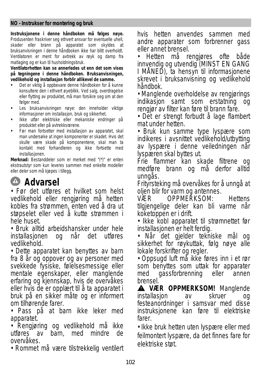 Montaje y modo de empleo Instruções para montagem e utilização ȅǻǾīǿǼȈ ȈȊȃǹȇȂȅȁȅīǾȈǾȈ Ȁǹǿ ȋȇǾȈǾȈ Monterings- och bruksanvisningar • La hotte doit être régulièrement nettoyée à la fois à l'intérieur et à l'extérieur (AU MOINS UNE FOIS PAR MOIS); cela devrait se faire en conformité avec les instructions d'entretien. Le non respect des instructions expressément fournies concernant le nettoyage de la hotte et des filtres peut provoquer des risques d'incendie. • Ne pas flamber d’aliments sous la hotte. • Pour le remplacement de la lampe, utilisez uniquement le type de lampe spécifié dans la section remplacement/maintenance lampe dans ce manuel. L'utilisation d'une flamme nue est dommageable pour les filtres et peut causer un incendie, par conséquent, il est déconseillé de l'utiliser. La friture doit être faite avec soin afin de s’assurer que l’huile surchauffée ne prenne pas feu. AVERTISSEMENT: Lorsque la table de cuisson est en fonctionnement, les parties accessibles de la hotte peuvent devenir très chaudes. • Ne pas brancher l'appareil au réseau électrique avant que l'installation ne soit complètement terminée. • En ce qui concerne les mesures techniques et de sécurité à prendre pour l'évacuation des fumées, respectez strictement les dispositions des règlements locales. • L’air ne doit pas être envoyé dans un conduit utilisé pour évacuer les fumées