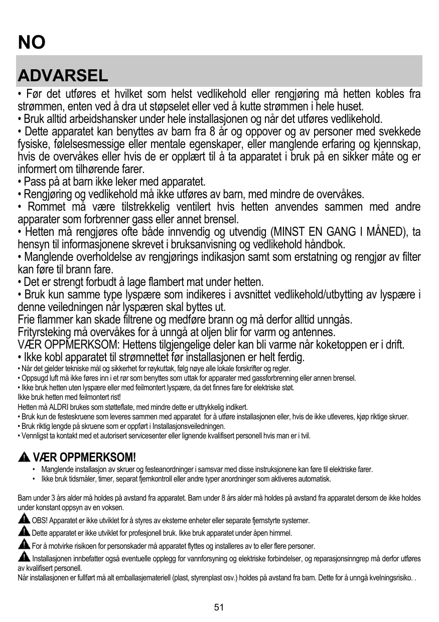 • Les enfants ne doivent pas jouer avec l’appareil. • Le nettoyage et l’entretien par l’usager ne doivent pas être effectués par des enfants sans surveillance. • La pièce doit avoir une aération suffisante lorsque la hotte est utilisée conjointement avec d'autres appareils fonctionnant au gaz ou autres combustibles. • La hotte doit être régulièrement nettoyée à la fois à l'intérieur et à l'extérieur (AU MOINS UNE FOIS PAR MOIS); cela devrait se faire en conformité avec les instructions d'entretien. Le non respect des instructions expressément fournies concernant le nettoyage de la hotte et des filtres peut provoquer des risques d'incendie. • Ne pas flamber d’aliments sous la hotte. • Pour le remplacement de la lampe, utilisez uniquement le type de lampe spécifié dans la section remplacement/maintenance lampe dans ce manuel. L'utilisation d'une flamme nue est dommageable pour les filtres et peut causer un incendie, par conséquent, il est déconseillé de l'utiliser. La friture doit être faite avec soin afin de s’assurer que l’huile surchauffée ne prenne pas feu. AVERTISSEMENT: Lorsque la table de cuisson est en fonctionnement, les parties accessibles de la hotte peuvent devenir très chaudes. • Ne pas brancher l'appareil au réseau électrique avant que l'installation ne soit complètement terminée.