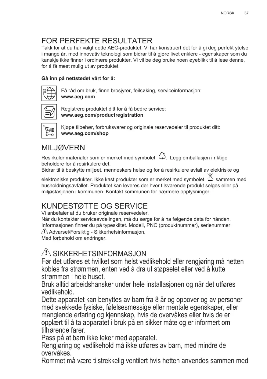 Vi anbefaler at du bruker originale reservedeler. Når du kontakter serviceavdelingen, må du sørge for å ha følgende data for hånden. Informasjonen finner du på typeskiltet. Modell, PNC (produktnummer), serienummer. Advarsel/Forsiktig - Sikkerhetsinformasjon. Med forbehold om endringer. SIKKERHETSINFORMASJON Før det utføres et hvilket som helst vedlikehold eller rengjøring må hetten kobles fra strømmen, enten ved å dra ut støpselet eller ved å kutte strømmen i hele huset. Bruk alltid arbeidshansker under hele installasjonen og når det utføres vedlikehold. Dette apparatet kan benyttes av barn fra 8 år og oppover og av personer med svekkede fysiske, følelsesmessige eller mentale egenskaper, eller manglende erfaring og kjennskap, hvis de overvåkes eller hvis de er opplært til å ta apparatet i bruk på en sikker måte og er informert om tilhørende farer. Pass på at barn ikke leker med apparatet. Rengjøring og vedlikehold må ikke utføres av barn, med mindre de overvåkes. Rommet må være tilstrekkelig ventilert hvis hetten anvendes sammen med