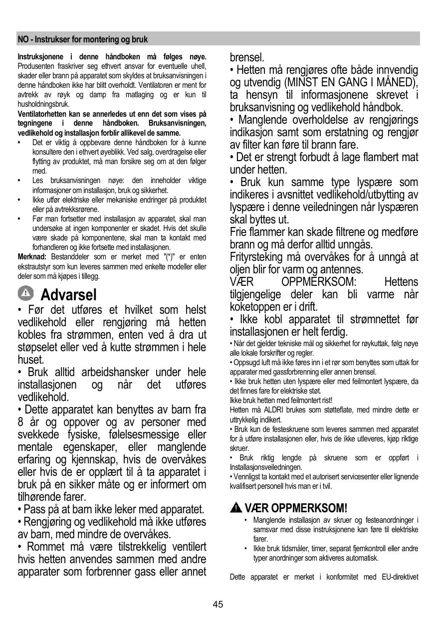 • L’air ne doit pas être envoyé dans un conduit utilisé pour évacuer les fumées d’appareils utilisant du gaz ou un autre combustible. • Ne pas utiliser ou laisser la hotte sans les lampes correctement montées, car un éventuel risque de choc électrique est possible. • N’utilisez jamais la hotte sans la grille montée correctement! • La hotte ne doit JAMAIS être utilisée comme une surface d'appui,