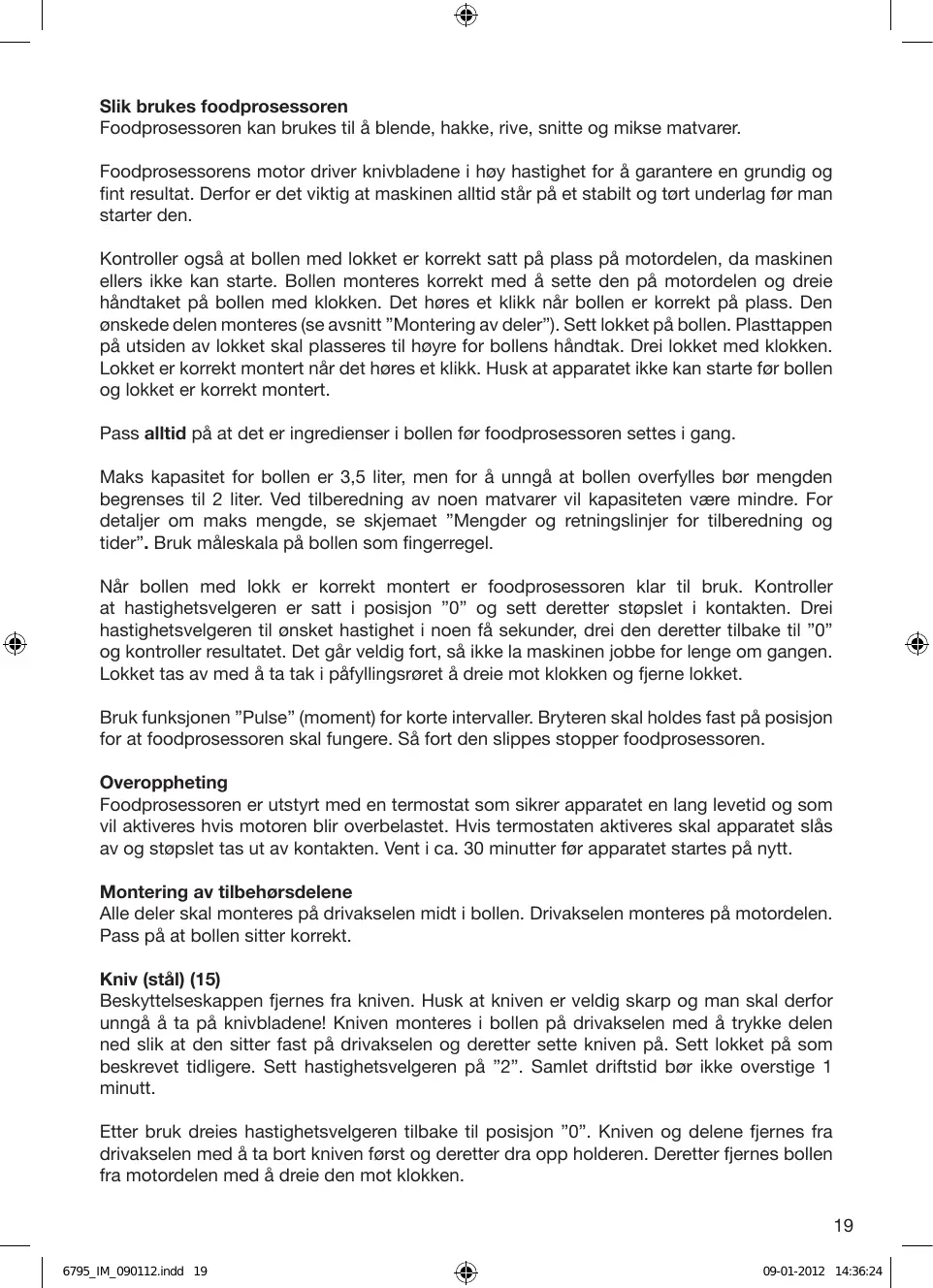 Foodprosessorens motor driver knivbladene i hoy hastighet for a garantere en grundig og finr resultat. Derfor er det viktig at maskinen alltid star pa et stabilt og tort underlag for man starter den.