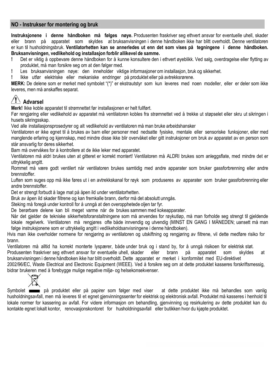 Avant toute opération de nettoyage ou d’entretien, débrancher la hotte du circuit électrique en retirant la prise ou en coupant l’interrupteur général de l’habitation. Munissez-vous de gants de travail avant d’effectuer toute opération d’installation et d’entretien. L’appareil n’est pas destiné à une utilisation par des enfants ou des personnes à capacités physiques, sensorielles ou mentales réduites et sans expérience et connaissance à moins qu’ils ne soient sous la supervision ou formés sur l’utilisation de l’appareil par une personne responsable de leur sécurité. Les enfants doivent être surveillés afin qu’ils ne jouent pas avec l’appareil. Ne jamais utiliser la hotte sans que la grille ne soit montée correctement! La hotte ne doit JAMAIS être utilisée comme plan pour déposer quelque chose sauf si cela est expressément indiqué. Quand la hotte est utilisée en même temps que d’autres appareils à combustion de gaz ou d’autres combustibles, le local doit disposer d’une ventilation suffisante. L’air aspiré ne doit jamais être envoyé dans un conduit utilisé pour l’évacuation des fumées produites par des appareils à combustion de gaz ou d’autres combustibles. Il est formellement interdit de faire flamber les aliments sous la hotte. L’utilisation de flammes libres peut entraîner des dégâts aux filtres et peut donner lieu à des incendies, il faut donc les éviter à tout prix. La friture d’aliments doit être réalisée sous contrôle pour éviter que l’huile surchauffée ne prenne feu. Les pièces accessibles peuvent se réchauffer de façon importante quand elles sont utilisées avec des appareils pour la cuisson. En ce qui concerne les mesures techniques et de sécurité à adopter pour l’évacuation des fumées, s’en tenir strictement à ce qui est prévu dans les règlements des autorités locales compétentes. La hotte doit être régulièrement nettoyée, aussi bien à l’intérieur qu’à l’extérieur (AU MOINS UNE FOIS PAR MOIS, respecter néanmoins les instructions relatives à l’entretien fournies dans ce manuel). La non observation de ces normes de nettoyage de la hotte et du changement et nettoyage des filtres comporte des risques d’incendie. Ne pas utiliser ou laisser la hotte sans que les ampoules soient correctement placées pour éviter tout risque de choc électrique. La société décline toute responsabilité pour d’éventuels inconvénients, dégâts ou incendies provoqués par l’appareil et dérivés de la non observation des instructions reprises dans ce manuel. Cet appareil porte le symbole du recyclage conformément à la Directive Européenne 2002/96/CE concernant les Déchets d’Équipements Électriques et Électroniques (DEEE ou WEEE). En procédant correctement à la mise au rebut de cet appareil, vous contribuerez à empêcher toute conséquence nuisible pour l’environnement et la santé de l’homme.