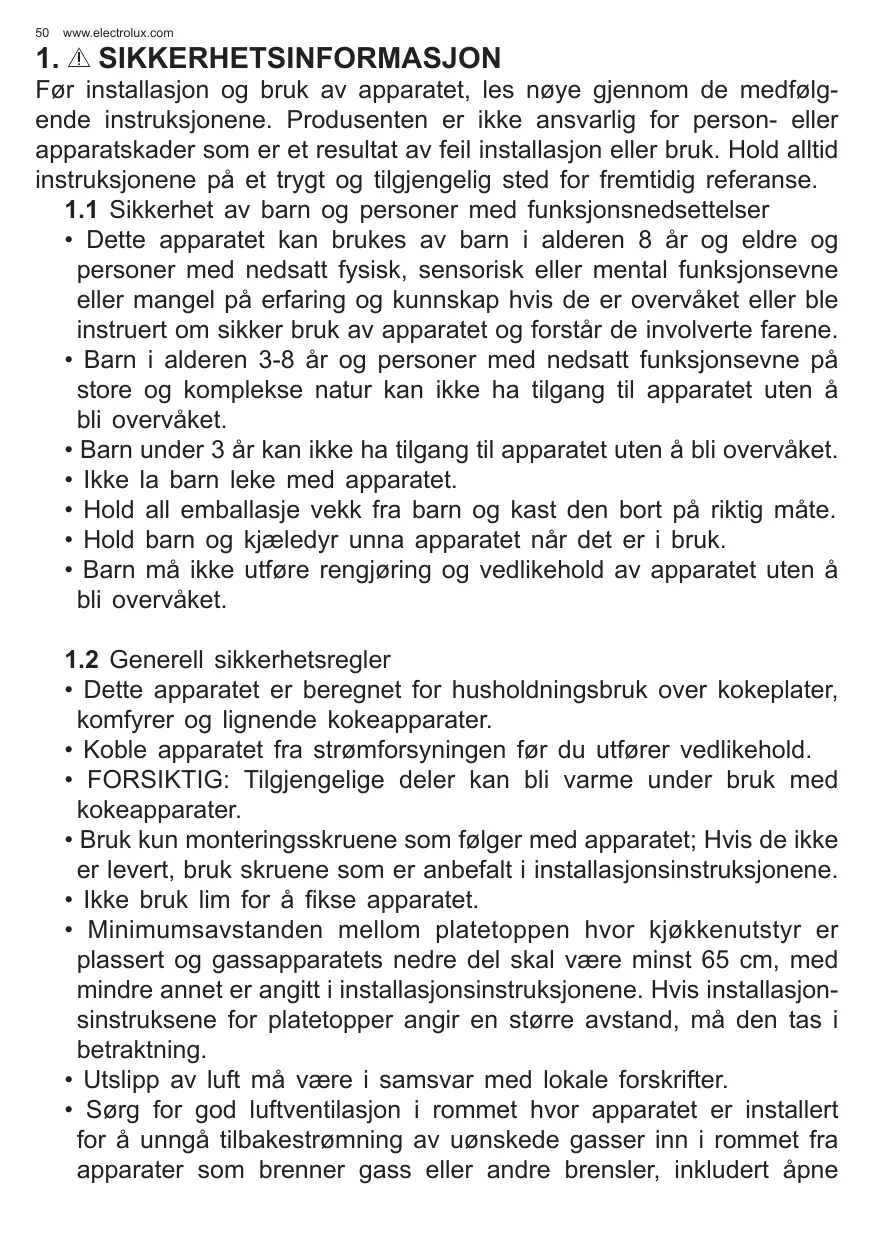 SIKKERHETSINFORMASJON Før installasjon og bruk av apparatet, les nøye gjennom de medfølgende instruksjonene. Produsenten er ikke ansvarlig for person- eller apparatskader som er et resultat av feil installasjon eller bruk. Hold alltid instruksjonene på et trygt og tilgjengelig sted for fremtidig referanse. 1.1 Sikkerhet av barn og personer med funksjonsnedsettelser • Dette apparatet kan brukes av barn i alderen 8 år og eldre og personer med nedsatt fysisk, sensorisk eller mental funksjonsevne eller mangel på erfaring og kunnskap hvis de er overvåket eller ble instruert om sikker bruk av apparatet og forstår de involverte farene. • Barn i alderen 3-8 år og personer med nedsatt funksjonsevne på store og komplekse natur kan ikke ha tilgang til apparatet uten å bli overvåket. • Barn under 3 år kan ikke ha tilgang til apparatet uten å bli overvåket. • Ikke la barn leke med apparatet. • Hold all emballasje vekk fra barn og kast den bort på riktig måte. • Hold barn og kjæledyr unna apparatet når det er i bruk. • Barn må ikke utføre rengjøring og vedlikehold av apparatet uten å bli overvåket. 1.2 Generell sikkerhetsregler • Dette apparatet er beregnet for husholdningsbruk over kokeplater, komfyrer og lignende kokeapparater. • Koble apparatet fra strømforsyningen før du utfører vedlikehold. • FORSIKTIG: Tilgjengelige deler kan bli varme under bruk med kokeapparater. • Bruk kun monteringsskruene som følger med apparatet; Hvis de ikke er levert, bruk skruene som er anbefalt i installasjonsinstruksjonene. • Ikke bruk lim for å fikse apparatet. • Minimumsavstanden mellom platetoppen hvor kjøkkenutstyr er plassert og gassapparatets nedre del skal være minst 65 cm, med mindre annet er angitt i installasjonsinstruksjonene. Hvis installasjonsinstruksene for platetopper angir en større avstand, må den tas i betraktning. • Utslipp av luft må være i samsvar med lokale forskrifter. • Sørg for god luftventilasjon i rommet hvor apparatet er installert for å unngå tilbakestrømning av uønskede gasser inn i rommet fra apparater som brenner gass eller andre brensler, inkludert åpne