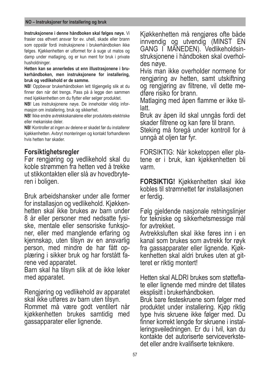 La hotte ne doit JAMAIS être utilisée comme un support, sauf indication contraire.