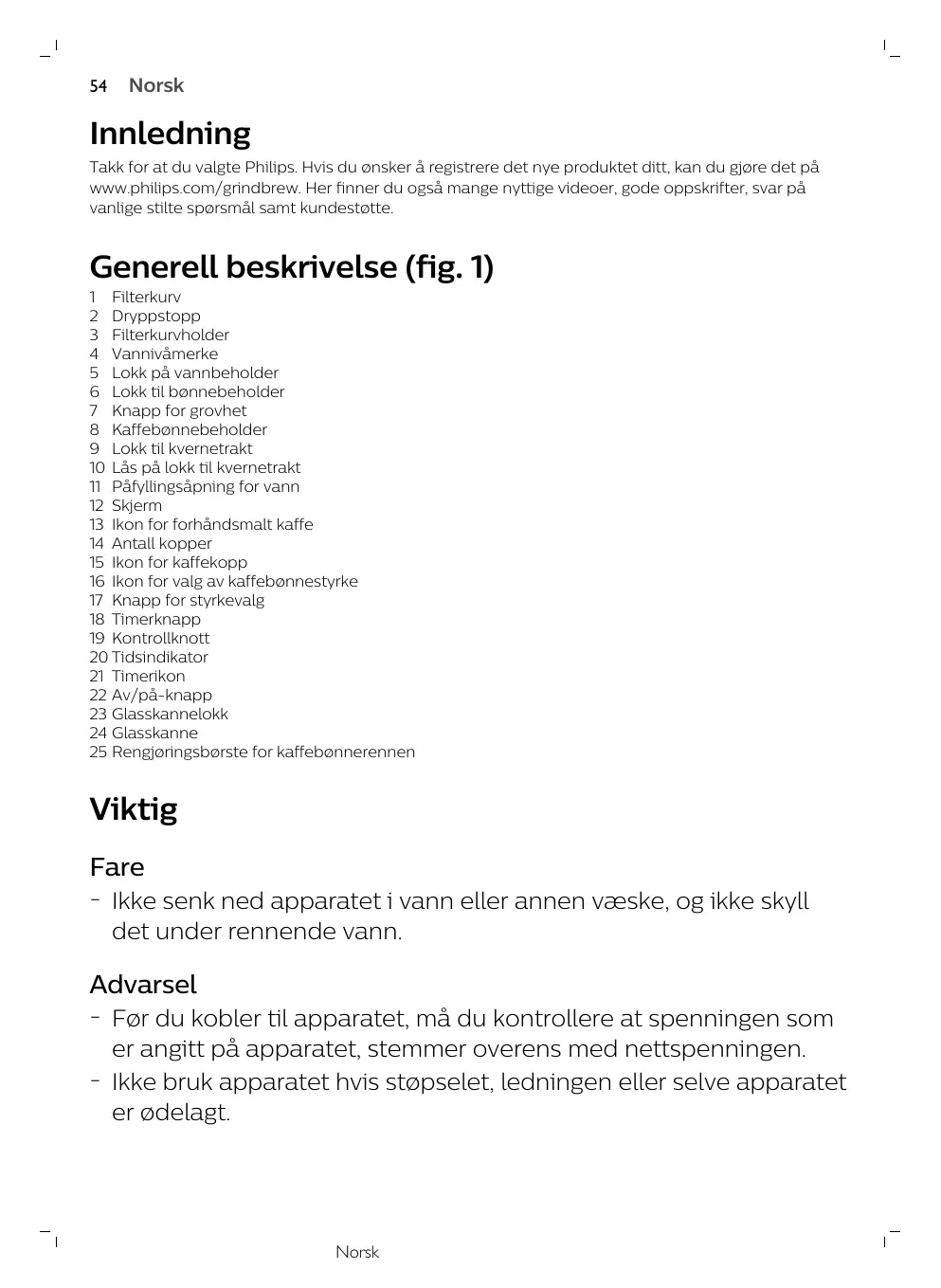 Forsiktig - Ikke plasser apparatet på en varm overflate, og pass på at ledningen ikke kommer i kontakt med varme overflater. - Ikke sett apparatet i et skap når det er i bruk. - Koble fra apparatet før du rengjør det, og hvis det oppstår problemer under malingen eller traktingen. - Sørg for å holde både støpselet og stikkontakten tørre. - Ikke løft og flytt på apparatet når det er i bruk. - Kannen er varm under og etter traktingen. Hold den alltid etter håndtaket. - Ikke sett kannen i en mikrobølgeovn. - Vent til apparatet er avkjølt før du legger det vekk. Varmeplaten og kaffekannen kan være varme. - Etter at du har pakket ut apparatet, må du kontrollere at det er i hel og uskadet stand. Hvis du er i tvil, må du ikke bruke apparatet, men ta kontakt med kundesenteret i landet der du bor. - Dette apparatet er ment å skulle brukes hjemme og på for eksempel gårder, overnattingssteder, personalkjøkken i butikker, kontorer og i andre jobbmiljøer, samt av kunder på hoteller, moteller og andre typer bomiljøer.