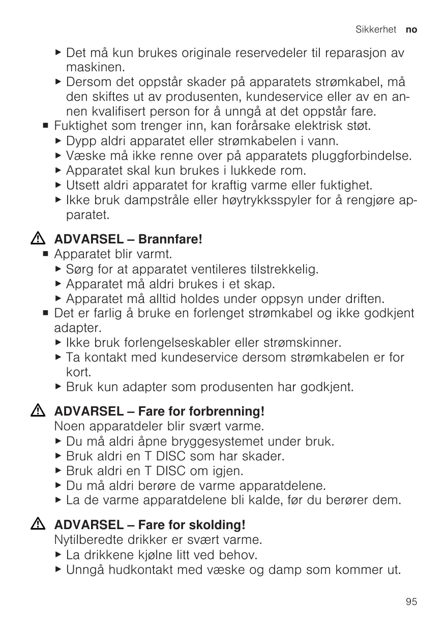 ▶ Det må kun brukes originale reservedeler til reparasjon av maskinen. ▶ Dersom det oppstår skader på apparatets strømkabel, må den skiftes ut av produsenten, kundeservice eller av en annen kvalifisert person for å unngå at det oppstår fare. ¡ Fuktighet som trenger inn, kan forårsake elektrisk støt. ▶ Dypp aldri apparatet eller strømkabelen i vann. ▶ Væske må ikke renne over på apparatets pluggforbindelse. ▶ Apparatet skal kun brukes i lukkede rom. ▶ Utsett aldri apparatet for kraftig varme eller fuktighet. ▶ Ikke bruk dampstråle eller høytrykksspyler for å rengjøre apparatet. ADVARSEL ‒ Brannfare! ¡ Apparatet blir varmt. ▶ Sørg for at apparatet ventileres tilstrekkelig. ▶ Apparatet må aldri brukes i et skap. ▶ Apparatet må alltid holdes under oppsyn under driften. ¡ Det er farlig å bruke en forlenget strømkabel og ikke godkjent adapter. ▶ Ikke bruk forlengelseskabler eller strømskinner. ▶ Ta kontakt med kundeservice dersom strømkabelen er for kort. ▶ Bruk kun adapter som produsenten har godkjent. ADVARSEL ‒ Fare for forbrenning! Noen apparatdeler blir svært varme. ▶ Du må aldri åpne bryggesystemet under bruk. ▶ Bruk aldri en T DISC som har skader. ▶ Bruk aldri en T DISC om igjen. ▶ Du må aldri berøre de varme apparatdelene. ▶ La de varme apparatdelene bli kalde, før du berører dem. ADVARSEL ‒ Fare for skolding! Nytilberedte drikker er svært varme. ▶ La drikkene kjølne litt ved behov. ▶ Unngå hudkontakt med væske og damp som kommer ut. 95