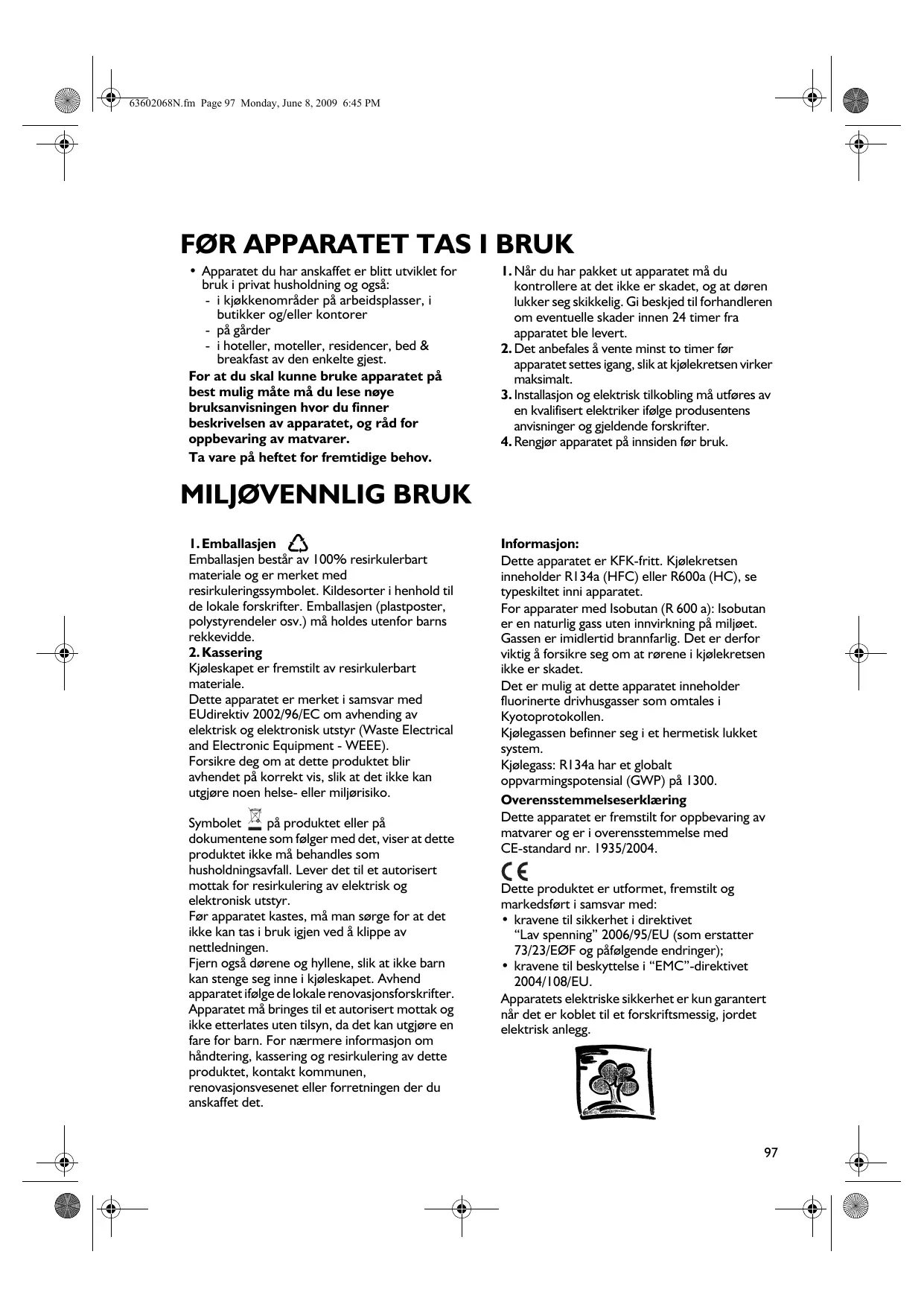 Cet appareil ne contient pas de CFC. Le circuit de refroidissement contient du R134a (HFC) ou R600a (HC), voir la plaquette signalétique à l’intérieur de l’appareil. Pour les appareils avec Isobutane (R600a) : l’isobutane est un gaz naturel qui est sans danger pour l’environnement, mais il est inflammable. Il est donc indispensable de s’assurer que les tuyaux du circuit de réfrigération sont en parfait état. Cet appareil pourrait contenir du gaz à effet de serre fluoré réglementé par le Protocole de Kyoto. Le gaz réfrigérant est hermétiquement scellé. Gaz réfrigérant: le R134 a une puissance de refroidissement (GWP) de 1300. Déclaration de conformité Cet appareil est destiné à la conservation de denrées alimentaires et est fabriqué conformément au règlement (CE) N° 1935/2004. Cet appareil a été conçu, construit et commercialisé conformément aux : • objectifs sécurité de la directive “Basse Tension” 2006/95/CE (qui remplace la 73/23/CEE et modifications); • conditions requises en matière de protection de la Directive “EMC” 2004/108/CE. La sécurité électrique de l’appareil est garantie uniquement lorsqu’il est correctement branché à une installation de mise à la terre efficace et conforme à la loi.