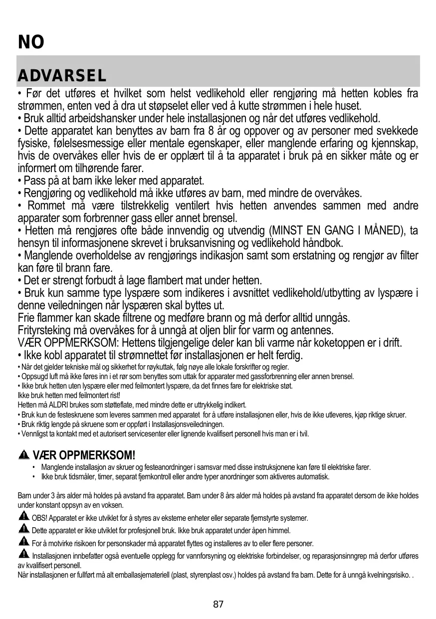 • Les enfants ne doivent pas jouer avec l’appareil. • Le nettoyage et l’entretien par l’usager ne doivent pas être effectués par des enfants sans surveillance. • La pièce doit avoir une aération suffisante lorsque la hotte est utilisée conjointement avec d'autres appareils fonctionnant au gaz ou autres combustibles. • La hotte doit être régulièrement nettoyée à la fois à l'intérieur et à l'extérieur (AU MOINS UNE FOIS PAR MOIS); cela devrait se faire en conformité avec les instructions d'entretien. Le non respect des instructions expressément fournies concernant le nettoyage de la hotte et des filtres peut provoquer des risques d'incendie. • Ne pas flamber d’aliments sous la hotte. • Pour le remplacement de la lampe, utilisez uniquement le type de lampe spécifié dans la section remplacement/maintenance lampe dans ce manuel. L'utilisation d'une flamme nue est dommageable pour les filtres et peut causer un incendie, par conséquent, il est déconseillé de l'utiliser. La friture doit être faite avec soin afin de s’assurer que l’huile surchauffée ne prenne pas feu. AVERTISSEMENT: Lorsque la table de cuisson est en fonctionnement, les parties accessibles de la hotte peuvent devenir très chaudes. • Ne pas brancher l'appareil au réseau électrique avant que l'installation ne soit complètement terminée.